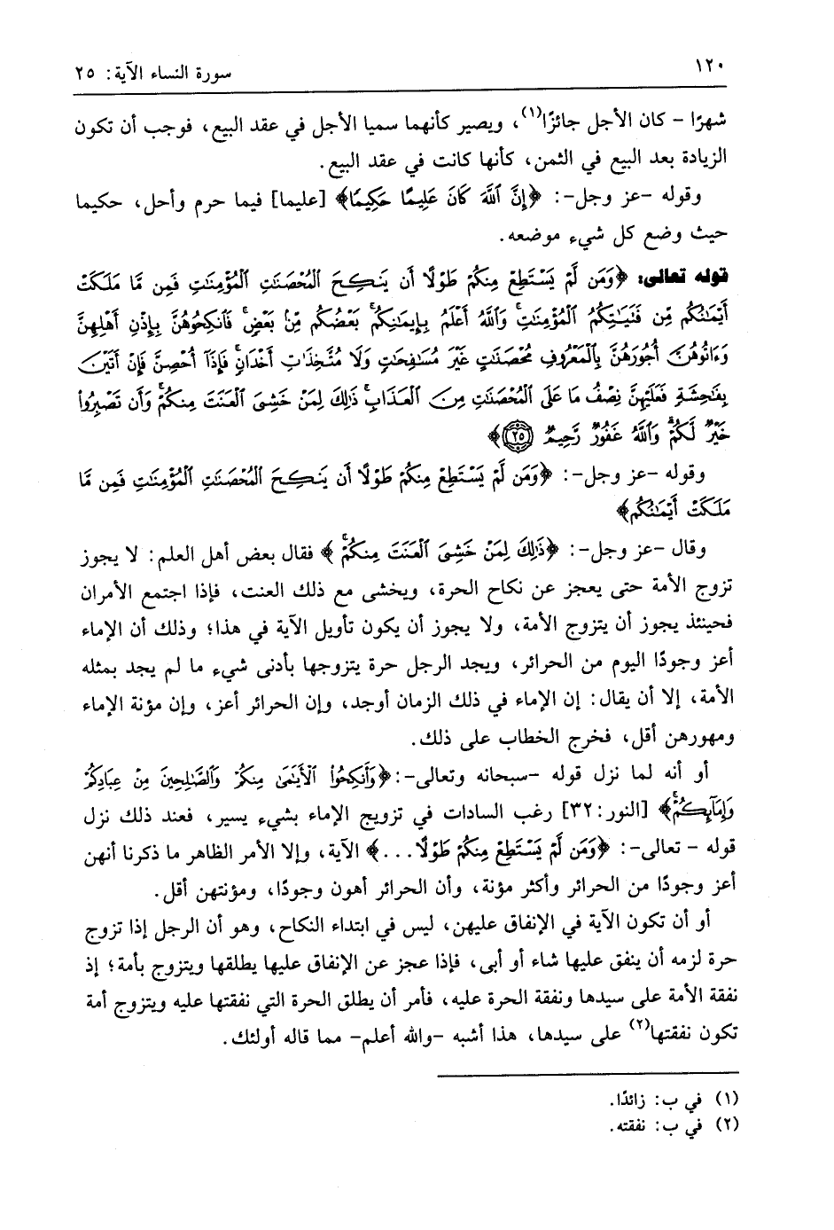 قوله تعالى: (وَمَنْ لَمْ يَسْتَطِعْ مِنْكُمْ طَوْلًا أَنْ يَنْكِحَ الْمُحْصَنَاتِ الْمُؤْمِنَاتِ فَمِنْ مَا مَلَكَتْ أَيْمَانُكُمْ مِنْ فَتَيَاتِكُمُ الْمُؤْمِنَاتِ وَاللَّهُ أَعْلَمُ بِإِيمَانِكُمْ بَعْضُكُمْ مِنْ بَعْضٍ فَانْكِحُوهُنَّ بِإِذْنِ أَهْلِهِنَّ وَآتُوهُنَّ أُجُورَهُنَّ بِالْمَعْرُوفِ مُحْصَنَاتٍ غَيْرَ مُسَافِحَاتٍ وَلَا مُتَّخِذَاتِ أَخْدَانٍ فَإِذَا أُحْصِنَّ فَإِنْ أَتَيْنَ بِفَاحِشَةٍ فَعَلَيْهِنَّ نِصْفُ مَا عَلَى الْمُحْصَنَاتِ مِنَ الْعَذَابِ ذَلِكَ لِمَنْ خَشِيَ الْعَنَتَ مِنْكُمْ وَأَنْ تَصْبِرُوا خَيْرٌ لَكُمْ وَاللَّهُ غَفُورٌ رَحِيمٌ (25)