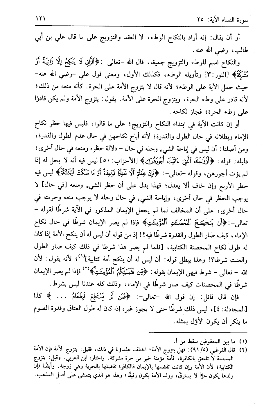 والنكاح اسم للوطء والتزويج جميعًا، قال اللَّه - تعالى -: (الزَّانِي لَا يَنْكِحُ إِلَّا زَانِيَةً أَوْ مُشْرِكَةً)، وتأويله الوطء، فكذلك الأول، ومعنى قول علي - رَضِيَ اللَّهُ عَنْهُ - حيث حمل الآية على الوطء؛ لأنه قال لا يتزوج الأمة على الحرة. كأنه منعه من ذلك؛ لأنه قادر على وطء الحرة، ويتزوج الحرة على الأمة. يقول: يتزوج الأمة ولم يكن قادرًا على وطء الحرة؛ فجاز نكاحه.
