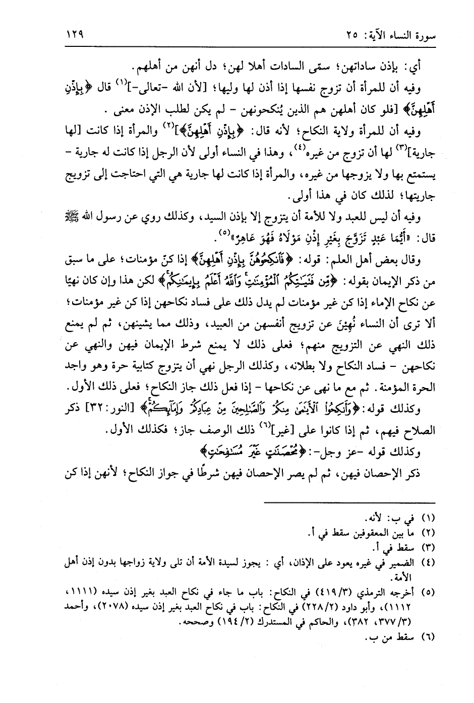 وقال بعض أهل العلم: قوله: (فَانْكِحُوهُنَّ بِإِذْنِ أَهْلِهِنَّ) إذا كن مؤمنات؛ على ما سبق من ذكر الإيمان بقوله: (مِنْ فَتَيَاتِكُمُ الْمُؤْمِنَاتِ وَاللَّهُ أَعْلَمُ بِإِيمَانِكُمْ) لكن هذا وإن كان نهيًا عن نكاح الإماء إذا كن غير مؤمنات لم يدل ذلك على فساد نكاحهن إذا كن غير مؤمنات؛ ألا ترى أن النساء نُهِينَ عن تزويج أنفسهن من العبيد، وذلك مما يشينهن، ثم لم يمنع ذلك النهي عن التزويج منهم؛ فعلى ذلك لا يمنع شرط الإيمان فيهن والنهي عن نكاحهن - فساد النكاح ولا بطلانه، وكذلك الرجل نهي أن يتزوج كتابية حرة وهو واجد الحرة المؤمنة. ثم مع ما نهى عن نكاحها - إذا فعل ذلك جاز النكاح، فعلى ذلك الأول.