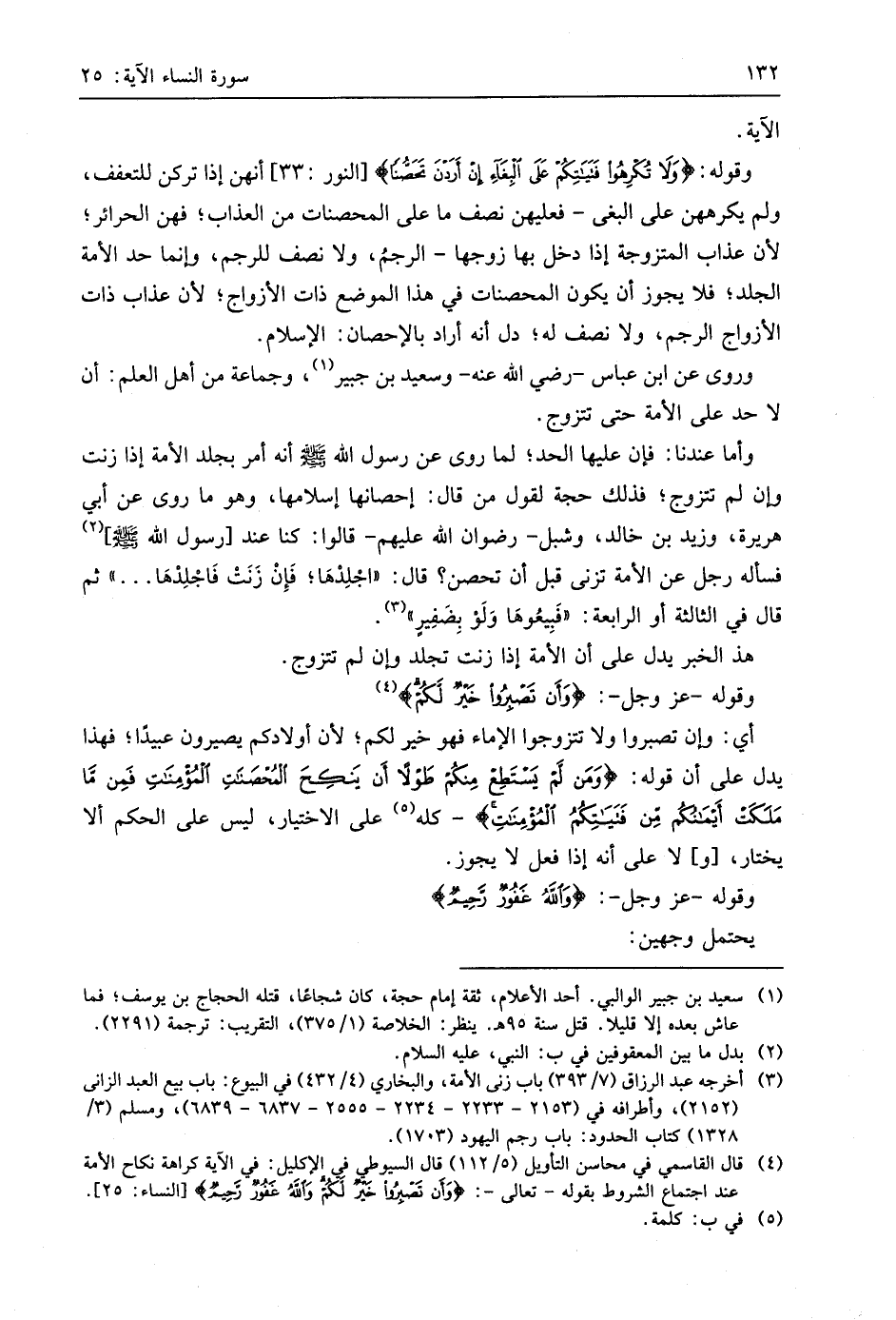 وقوله: (وَلَا تُكْرِهُوا فَتَيَاتِكُمْ عَلَى الْبِغَاءِ إِنْ أَرَدْنَ تَحَصُّنًا)، أنهن إذا تركن للتعفف، ولم يكرههن على البغي - فعليهن نصف ما على المحصنات من العذاب؛ فهن الحرائر؛ لأن عذاب المتزوجة إذا دخل بها زوجها - الرجمُ، ولا نصف للرجم، وإنما حد الأمة الجلد؛ فلا يجوز أن يكون المحصنات في هذا الموضع ذات الأزواج؛ لأن عذاب ذات الأزواج الرجم، ولا نصف له؛ دل أنه أراد بالإحصان: الإسلام.