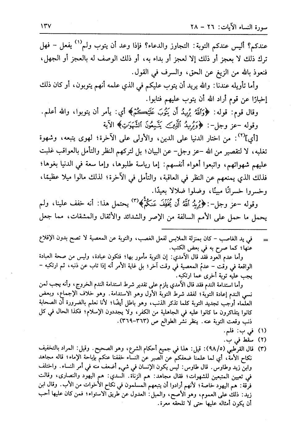 وأما تأويله عندنا: واللَّه يريد أن يتوب عليكم في الذي علمه أنهم يتوبون، أو كان ذلك إخبارًا عن قوم أراد اللَّه أن يتوب عليهم فتابوا.