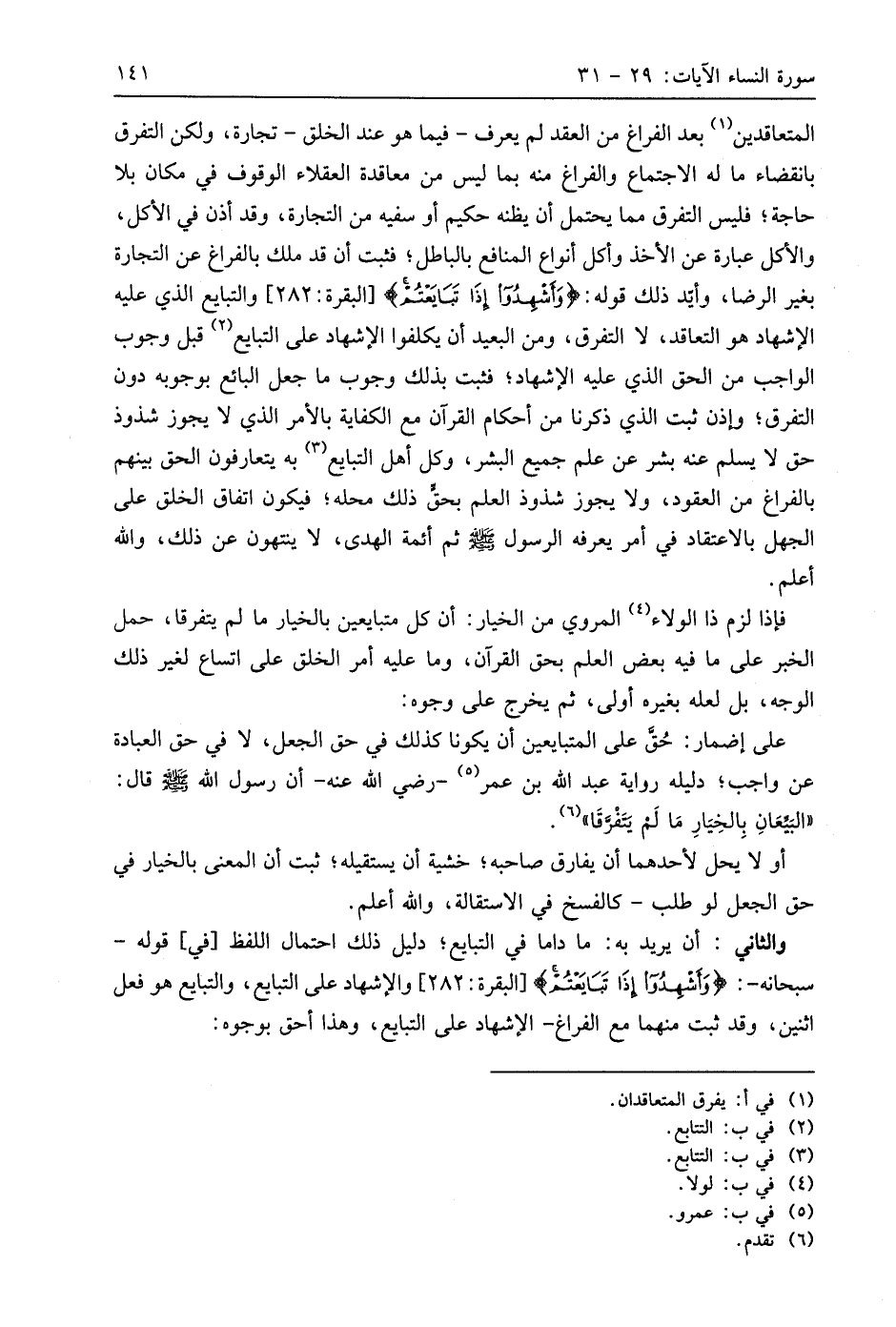 المتعاقدين بعد الفراغ من العقد لم يعرف -فيما هو عند الخلق- تجارة، ولكن التفرق بانقضاء ما له الاجتماع والفراغ منه بما ليس من معاقدة العقلاء الوقوف في مكان بلا حاجة؛ فليس التفرق مما يحتمل أن يظنه حكيم أو سفيه من التجارة، وقد أذن في الأكل، والأكل عبارة عن الأخذ وأكل أنواع المنافع بالباطل؛ فثبت أن قد ملك بالفراغ عن التجارة بغير الرضا، وأيد ذلك قوله: (وَأَشْهِدُوا إِذَا تَبَايَعْتُمْ) والتبايع الذي عليه الإشهاد هو التعاقد، لا التفرق، ومن البعيد أن يكلفوا الإشهاد على التبايع قبل وجوب الواجب من الحق الذي عليه الإشهاد؛ فثبت بذلك وجوب ما جعل البائع بوجوبه دون التفرق؛ وإذن ثبت الذي ذكرنا من أحكام القرآن مع الكفاية بالأمر الذي لا يجوز شذوذ حق لا يسلم عنه بشر عن علم جميع البشر، وكل أهل التبايع به يتعارفون الحق بينهم بالفراغ من العقود، ولا يجوز شذوذ العلم بحق ذلك محله؛ فيكون اتفاق الخلق على الجهل بالاعتقاد في أمر يعرفه الرسول - صَلَّى اللَّهُ عَلَيهِ وَسَلَّمَ - ثم أئمة الهدى، لا ينتهون عن ذلك، واللَّه أعلم.