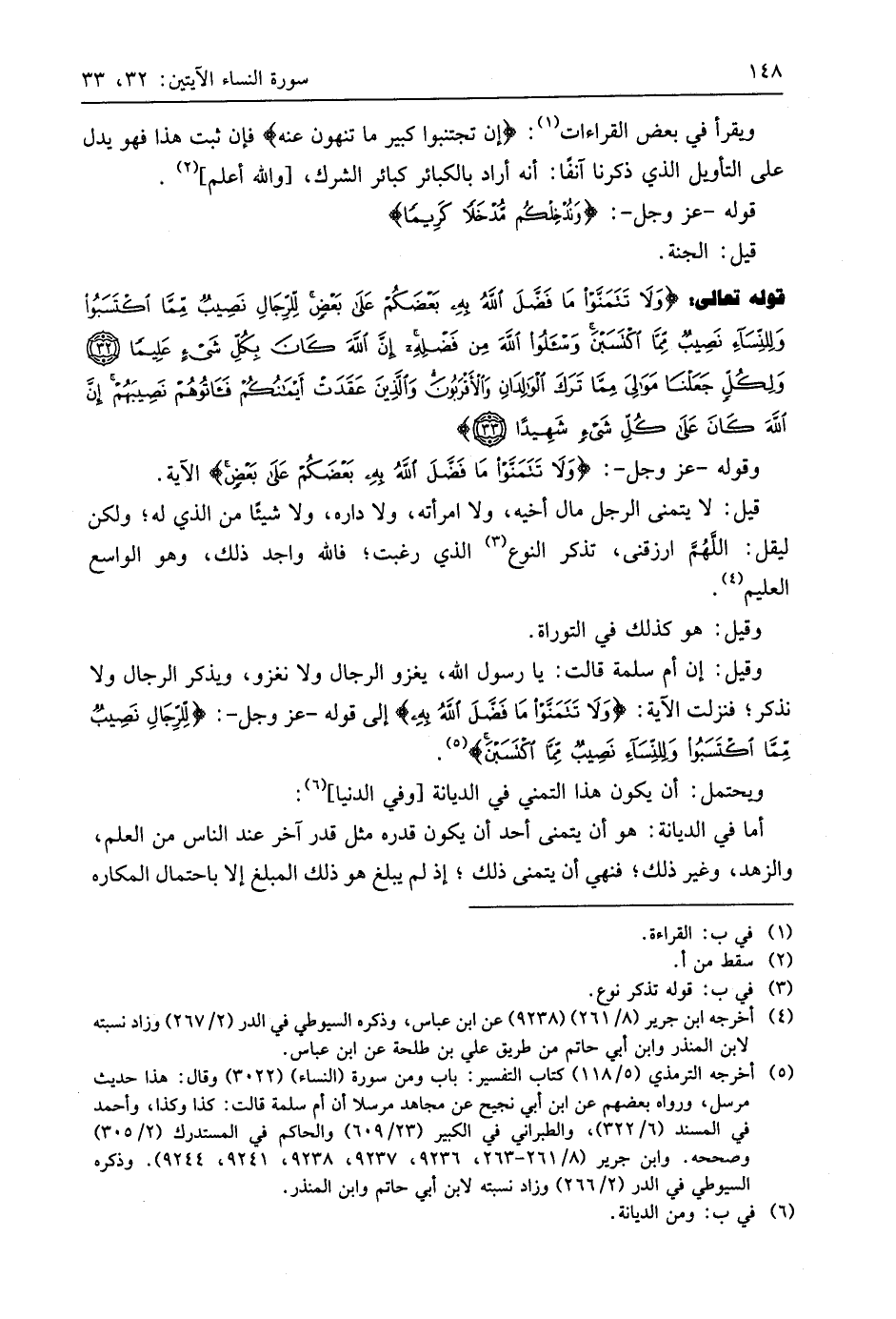 قوله تعالى: (وَلَا تَتَمَنَّوْا مَا فَضَّلَ اللَّهُ بِهِ بَعْضَكُمْ عَلَى بَعْضٍ لِلرِّجَالِ نَصِيبٌ مِمَّا اكْتَسَبُوا وَلِلنِّسَاءِ نَصِيبٌ مِمَّا اكْتَسَبْنَ وَاسْأَلُوا اللَّهَ مِنْ فَضْلِهِ إِنَّ اللَّهَ كَانَ بِكُلِّ شَيْءٍ عَلِيمًا (32) وَلِكُلٍّ جَعَلْنَا مَوَالِيَ مِمَّا تَرَكَ الْوَالِدَانِ وَالْأَقْرَبُونَ وَالَّذِينَ عَقَدَتْ أَيْمَانُكُمْ فَآتُوهُمْ نَصِيبَهُمْ إِنَّ اللَّهَ كَانَ عَلَى كُلِّ شَيْءٍ شَهِيدًا (33)