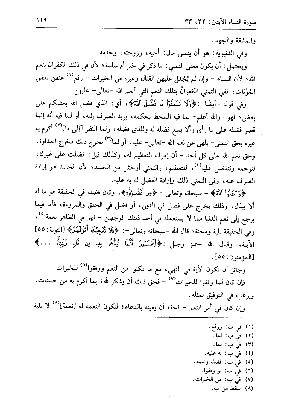 وفي قوله -أيضًا-: (وَلَا تَتَمَنَّوْا مَا فَضَّلَ اللَّهُ)، أي: الذي فضل اللَّه بعضكم على بعض؛ فهو - واللَّه أعلم - لما فيه السخط بحكمه، يريد الصرف إليه، أو لما فيه أنه إنما قصر فضله على ما رأى وألا يسع فضله له وللذي فضله، ولما النظر إلى ما أكرم به غيره بحق التمني -يلهى عن نعم اللَّه- تعالى عليه، أو لما يخرج ذلك مخرج العداوة، وحق نعم اللَّه على كل أحد - أن يُعرف التعظيم له، وكذلك قيل: فضلت على غيرك؛ لترحمه وتتفضل عليه؛ للتعظيم، والتمني أوخش من الحسد؛ لأن الحسد هو إرادة الصرف عنه، وفي التمني ذلك وإرادة الفضل له به عليه.