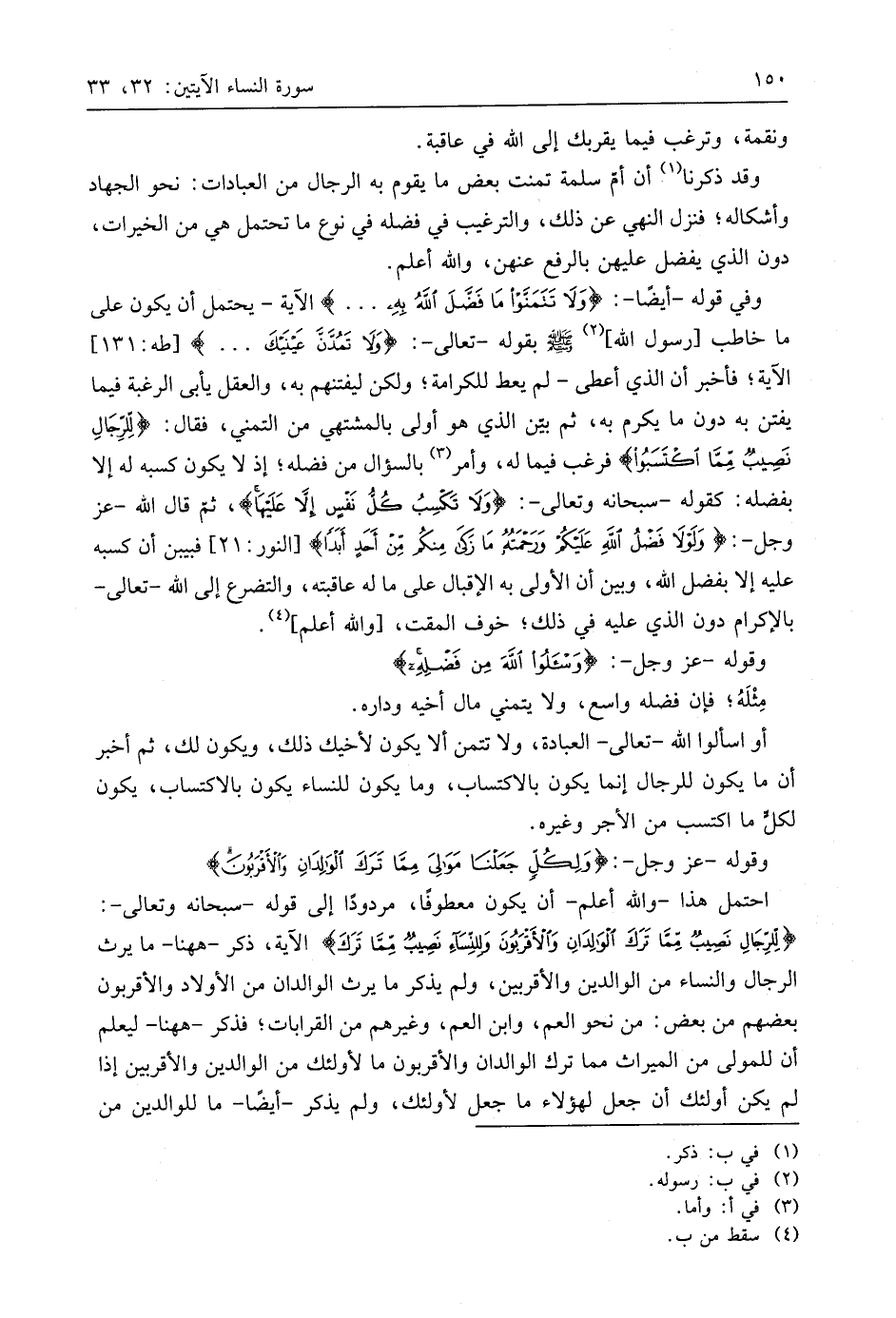 وقد ذكرنا أن أم سلمة تمنت بعض ما يقوم به الرجال من العبادات: نحو الجهاد وأشكاله؛ فنزل النهي عن ذلك، والترغيب في فضله في نوع ما تحتمل هي من الخيرات، دون الذي يفضل عليهن بالرفع عنهن، واللَّه أعلم.