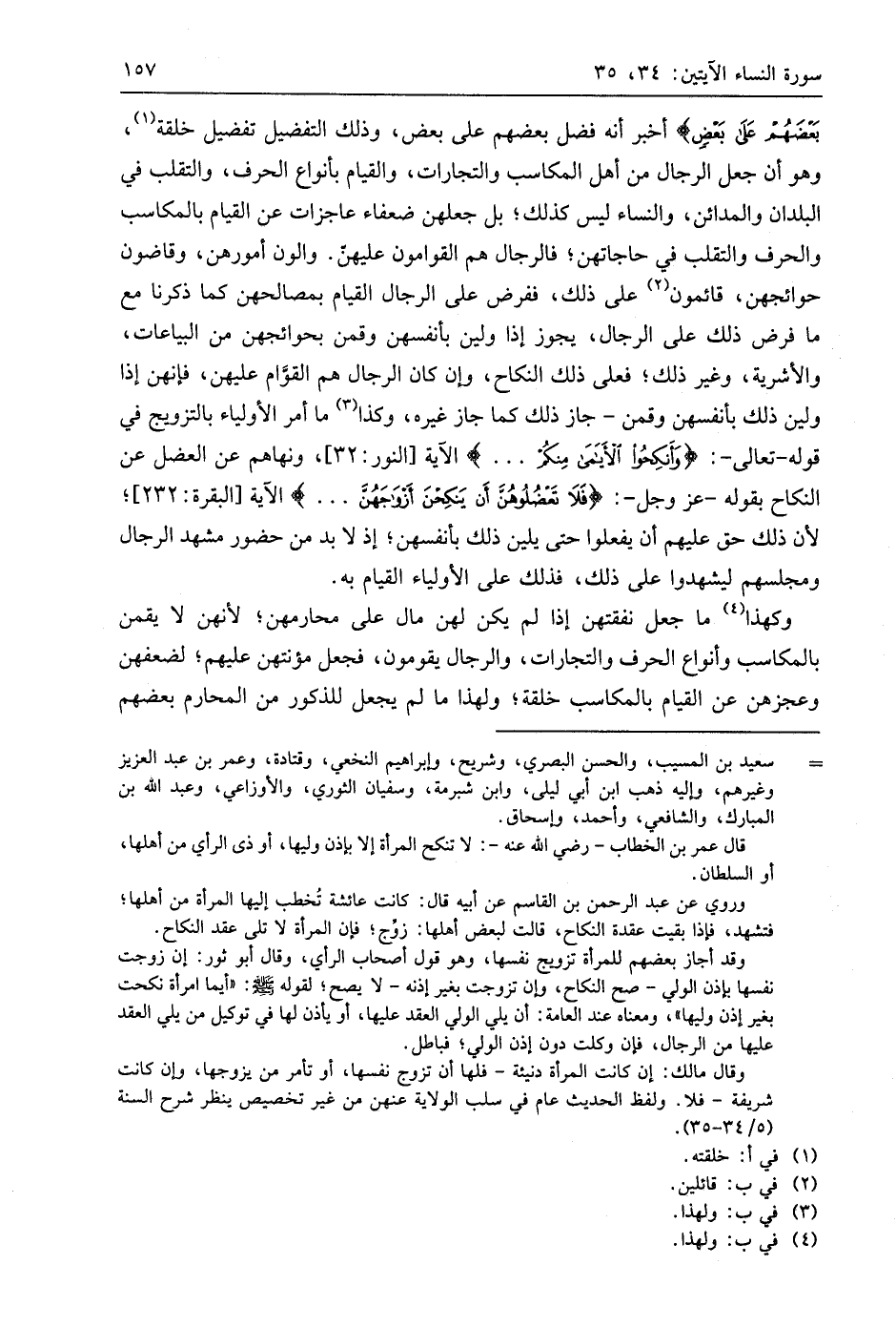 بَعْضَهُمْ عَلَى بَعْضٍ) أخبر أنه فضل بعضهم على بعض، وذلك التفضيل تفضيل خلقة، وهو أن جعل الرجال من أهل المكاسب والتجارات، والقيام بأنواع الحرف، والتقلب في البلدان والمدائن، والنساء ليس كذلك؛ بل جعلهن ضعفاء عاجزات عن القيام بالمكاسب والحرف والتقلب في حاجاتهن؛ فالرجال هم القوامون عليهن. وَالُونَ أمورهن، وقاضون حوائجهن، قائمون على ذلك، ففرض على الرجال القيام بمصالحهن كما ذكرنا مع ما فرض ذلك على الرجال، يجوز إذا ولين بأنفسهن وقمن بحوائجهن من البياعات، والأشرية، وغير ذلك؛ فعلى ذلك النكاح، وإن كان الرجال هم القوَّام عليهن، فإنهن إذا ولين ذلك بأنفسهن وقمن - جاز ذلك كما جاز غيره، وكذا ما أمر الأولياء بالتزويج في قوله - تعالى -: (وَأَنْكِحُوا الْأَيَامَى مِنْكُمْ. . .) الآية، ونهاهم عن العضل عن النكاح بقوله - عَزَّ وَجَلَّ -: (فَلَا تَعْضُلُوهُنَّ أَنْ يَنْكِحْنَ أَزْوَاجَهُنَّ. . .) الآية؛ لأن ذلك حق عليهم أن يفعلوا حتى يلين ذلك بأنفسهن؛ إذ لا بد من حضور مشهد الرجال ومجلسهم ليشهدوا على ذلك، فذلك على الأولياء القيام به.