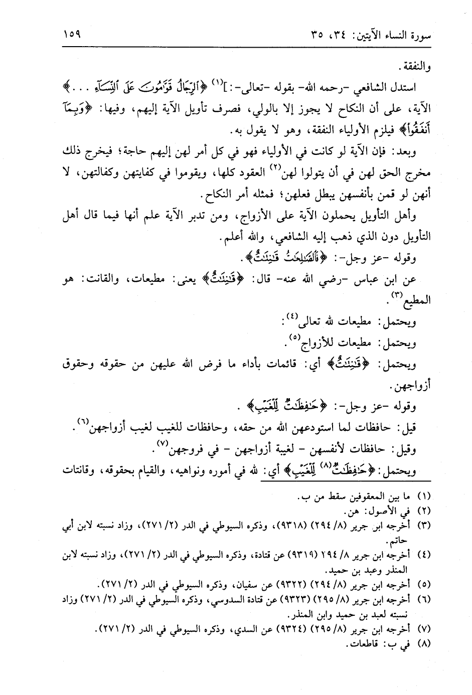 ويحتمل: (قَانِتَاتٌ) أي: قائمات بأداء ما فرض اللَّه عليهن من حقوقه وحقوق أز وا جهن.