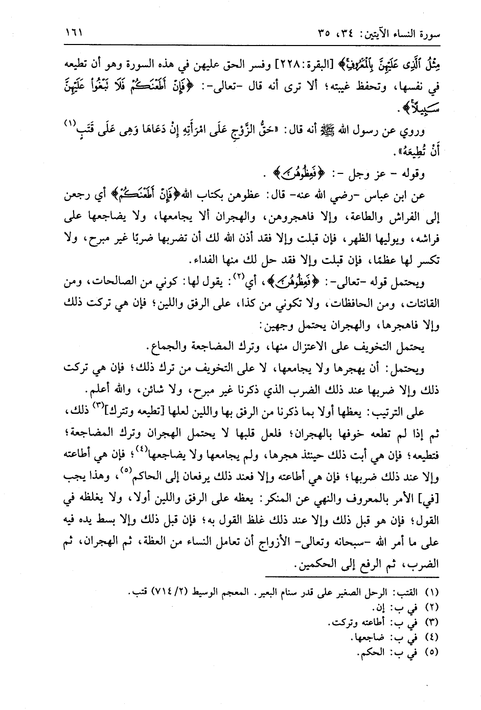 مِثْلُ الَّذِي عَلَيْهِنَّ بِالْمَعْرُوفِ)، وفسر الحق عليهن في هذه السورة وهو أن تطيعه في نفسها، وتحفظ غيبته؛ ألا ترى أنه قال - تعالى -: (فَإِنْ أَطَعْنَكُمْ فَلَا تَبْغُوا عَلَيْهِنَّ سَبِيلًا).