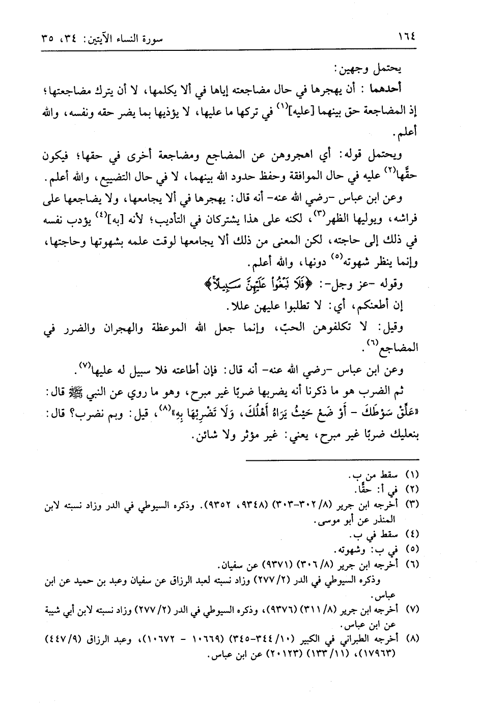 وعن ابن عَبَّاسٍ - رَضِيَ اللَّهُ عَنْهُ - أنه قال: يهجرها في ألا يجامعها، ولا يضاجعها على فراشه، ويوليها الظهر، لكنه على هذا يشتركان في التأديب؛ لأنه به يؤدب نفسه في ذلك إلى حاجته، لكن المعنى من ذلك ألا يجامعها لوقت علمه بشهوتها وحاجتها، وإنما ينظر شهوته دونها، واللَّه أعلم.