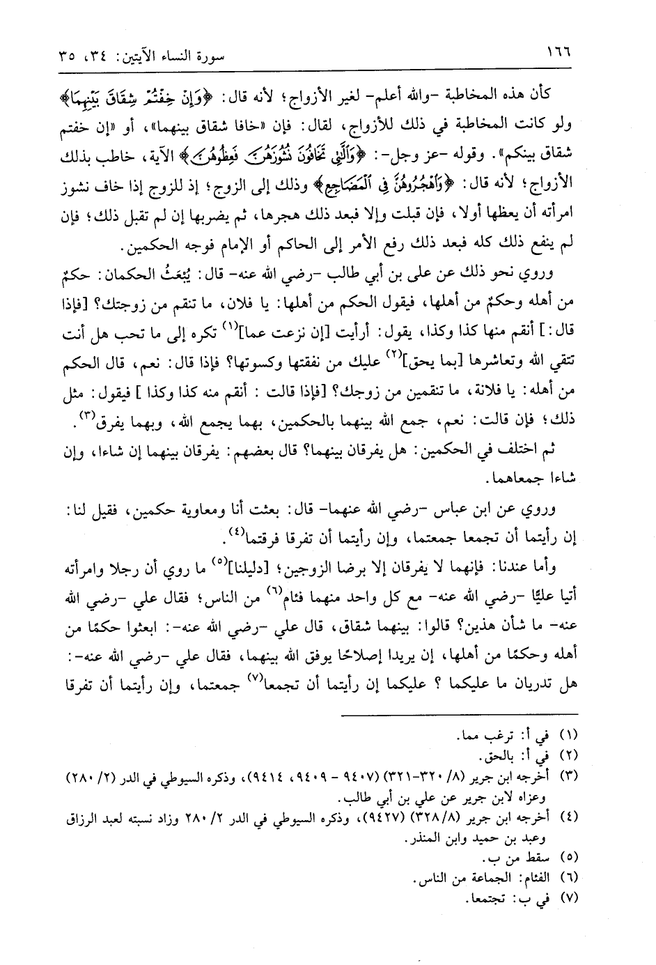 وروي نحو ذلك عن عليٍّ بن أبي طالب - رضي اللَّه عنه - قال: يُبعَثُ الحكمان: حكمٌ من أهله وحكمٌ من أهلها، فيقول الحكم من أهلها: يا فلان، ما تنقم من زوجتك؟ فإذا قال: أنقم منها كذا وكذا، يقول: أرأيت إن نزعت عما تكره إلى ما تحب هل أنت تتقي اللَّه وتعاشرها بما يحق عليك من نفقتها وكسوتها؟ فإذا قال: نعم، قال الحكم من أهله: يا فلانة، ما تنقمين من زوجك؟ فإذا قالت: أنقم منه كذا وكذا، فيقول: مثل ذلك؛ فإن قالت: نعم، جمع اللَّه بينهما بالحكمين، بهما يجمع اللَّه، وبهما يفرق.