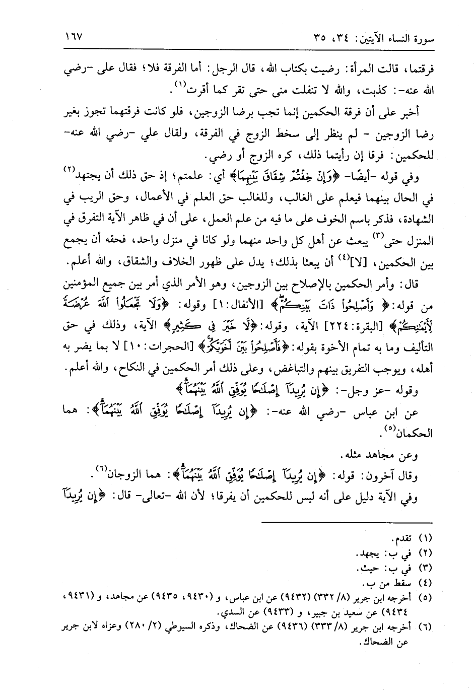 عن ابن عَبَّاسٍ - رَضِيَ اللَّهُ عَنْهُ -: (إِنْ يُرِيدَا إِصْلَاحًا يُوَفِّقِ اللَّهُ بَيْنَهُمَا): هما الحكمان.
