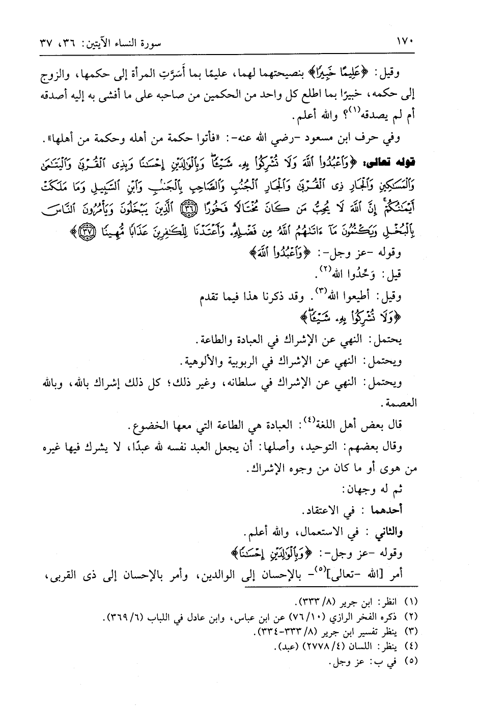 قوله تعالى: (وَاعْبُدُوا اللَّهَ وَلَا تُشْرِكُوا بِهِ شَيْئًا وَبِالْوَالِدَيْنِ إِحْسَانًا وَبِذِي الْقُرْبَى وَالْيَتَامَى وَالْمَسَاكِينِ وَالْجَارِ ذِي الْقُرْبَى وَالْجَارِ الْجُنُبِ وَالصَّاحِبِ بِالْجَنْبِ وَابْنِ السَّبِيلِ وَمَا مَلَكَتْ أَيْمَانُكُمْ إِنَّ اللَّهَ لَا يُحِبُّ مَنْ كَانَ مُخْتَالًا فَخُورًا (36) الَّذِينَ يَبْخَلُونَ وَيَأْمُرُونَ النَّاسَ بِالْبُخْلِ وَيَكْتُمُونَ مَا آتَاهُمُ اللَّهُ مِنْ فَضْلِهِ وَأَعْتَدْنَا لِلْكَافِرِينَ عَذَابًا مُهِينًا (37)