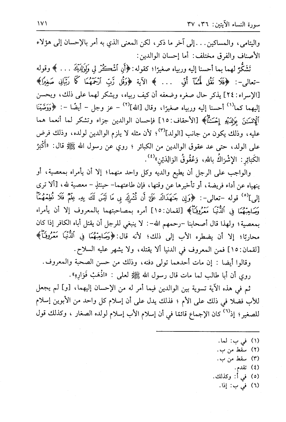 تَشَكُو لهما بما أحسنا إليه وربياه صغيرًا؛ كقوله: (أَنِ اشْكُرْ لِي وَلِوَالِدَيْكَ. . .) وقوله - تعالى -: (فَلَا تَقُلْ لَهُمَا أُفٍّ. . .) الآية (وَقُلْ رَبِّ ارْحَمْهُمَا كَمَا رَبَّيَانِي صَغِيرًا) يذكر حال صغره وضعفه أن كيف ربياه، ويشكر لهما على ذلك، ويحسن إليهما كما أحسنا إليه وربياه صغيرًا، وقال اللَّه، - عَزَّ وَجَلَّ -أيضًا-: (وَوَصَّيْنَا الْإِنْسَانَ بِوَالِدَيْهِ إِحْسَانًا)، فإحسان الوالدين جزاء وتشكر لما أنعما هما عليه، وذلك يكون من جانب الولد؛ لأن مثله لا يلزم الوالدين لولده، وذلك فرض على الولد، حتى عد عقوق الوالدين من الكبائر؛ روي عن رسول اللَّه - صَلَّى اللَّهُ عَلَيهِ وَسَلَّمَ - قال: " أَكْبَرُ الكَبَائِرِ: الإشْرَاكُ باللَّهَ، وَعُقُوقُ الوَالِدَيْنِ ".