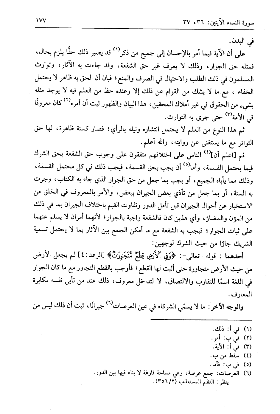 على أن الآية فيما أمر بالإحسان إلى جميع من ذكر قد يصير ذلك حقا يلزم بحال، فمثله حق الجوار، وذلك لا يعرف غير حق الشفعة، وقد جاءت به الآثار، وثوارث المسلمون في ذلك الطلب والاحتيال في الصرف والمنع؛ فبان أن الحق به ظاهر لا يحتمل الخفاء، مع ما لا يشك من القوام عن ذلك إلا وعنده حظ من العلم فيه لا يوجد مثله بشيء من الحقوق في غير أملاك المحقين، هذا البيان والظهور ثبت أن أمره كان معروفًا في الأمة حتى جرى به التوارث.