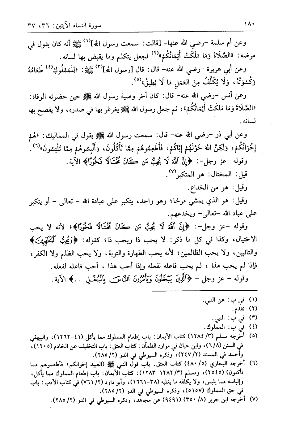وقوله - عَزَّ وَجَلَّ -: (إِنَّ اللَّهَ لَا يُحِبُّ مَنْ كَانَ مُخْتَالًا فَخُورًا) الآية.