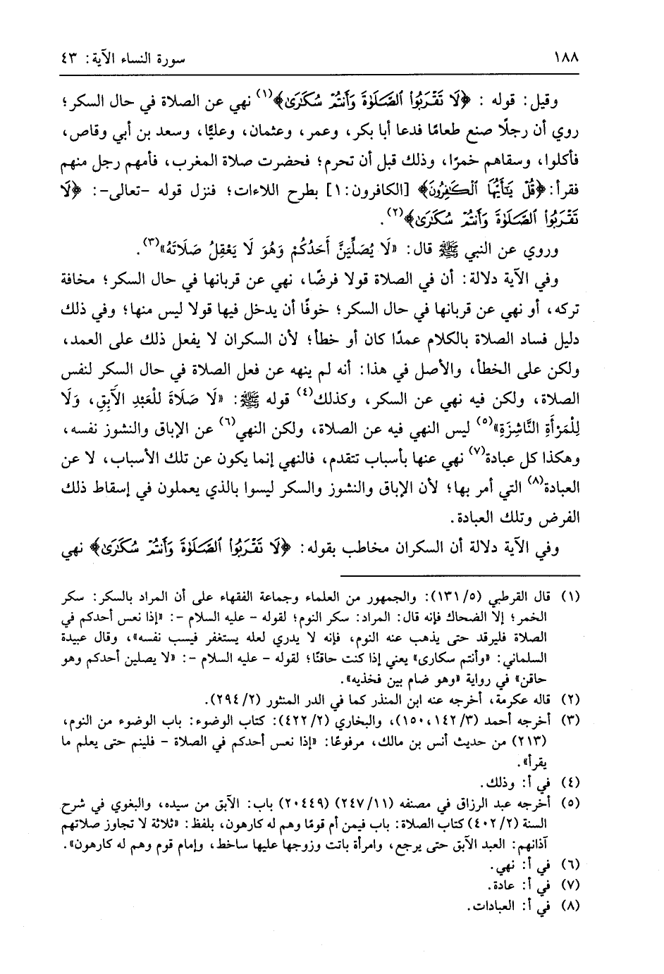 وقيل: قوله: (لَا تَقْرَبُوا الصَّلَاةَ وَأَنْتُمْ سُكَارَى) نهي عن الصلاة في حال السكر؛ روي أن رجلًا صنع طعامًا فدعا أبا بكر، وعمر، وعثمان، وعليًّا، وسعد بن أبي وقاص، فأكلوا، وسقاهم خمرًا، وذلك قبل أن تحرم؛ فحضرت صلاة المغرب، فأمهم رجل منهم فقرأ: (قُلْ يَا أَيُّهَا الكافرون)، بطرح اللاءات؛ فنزل قوله - تعالى -: (لَا تَقْرَبُوا الصَّلَاةَ وَأَنْتُمْ سُكَارَى).