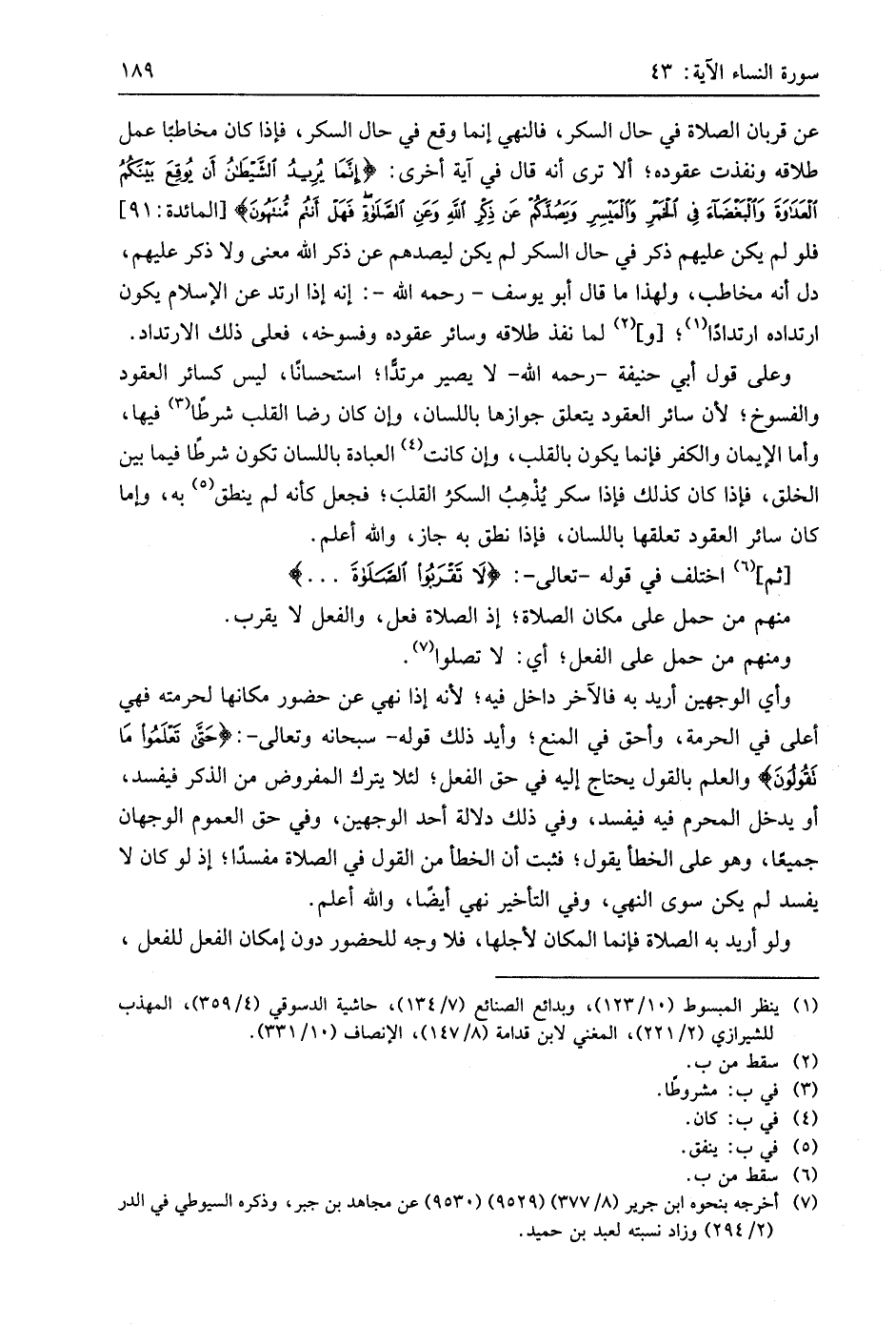 وأي الوجهين أريد به فالآخر داخل فيه؛ لأنه إذا نهي عن حضور مكانها لحرمته فهي أعلى في الحرمة، وأحق في المنع؛ وأيد ذلك قوله - سبحانه وتعالى -: (حَتَّى تَعْلَمُوا مَا تَقُولُونَ) والعلم بالقول يحتاج إليه في حق الفعل؛ لئلا يترك المفروض من الذكر فيفسد، أو يدخل المحرم فيه فيفسد، وفي ذلك دلالة أحد الوجهين، وفي حق العموم الوجهان جميعًا، وهو على الخطأ يقول؛ فثبت أن الخطأ من القول في الصلاة مفسدًا؛ إذ لو كان لا يفسد لم يكن سوى النهي، وفي التأخير نهي أيضًا، واللَّه أعلم.