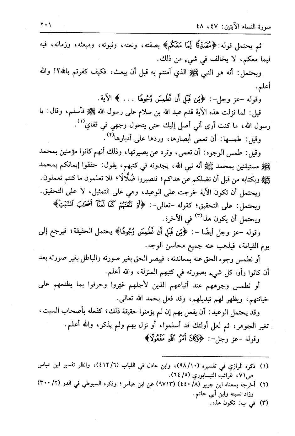 وقوله - عَزَّ وَجَلَّ أيضًا -: (مِنْ قَبْلِ أَنْ نَطْمِسَ وُجُوهًا) يحتمل الحقيقة؛ فيرجع إلى يوم القيامة، فيذهب عنه جميع محاسن الوجه.