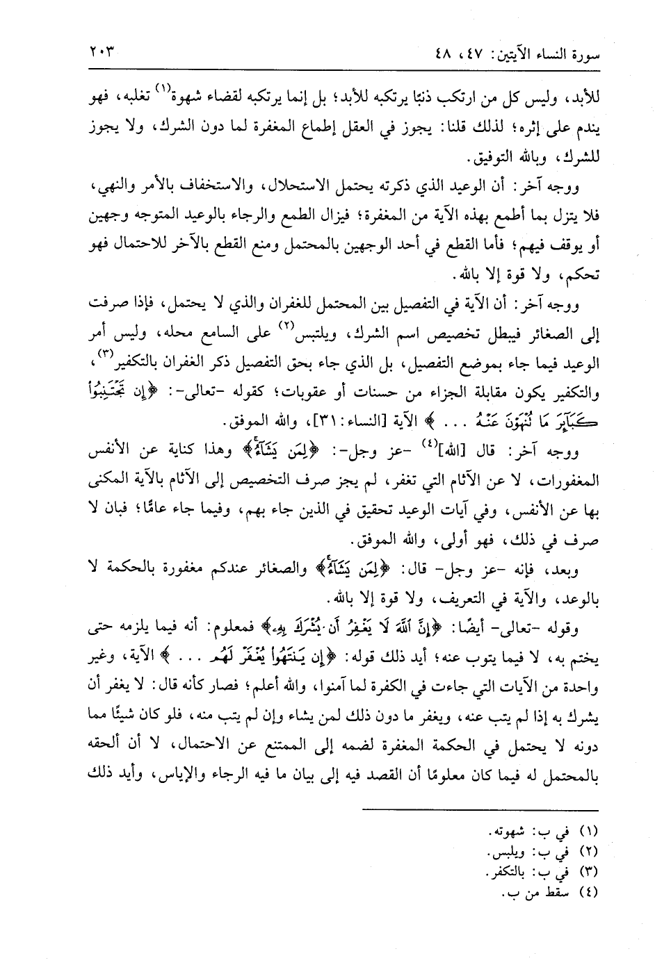 ووجه آخر: أن الآية في التفصيل بين المحتمل للغفران والذي لا يحتمل، فإذا صرفت إلى الصغائر فيبطل تخصيص اسم الشرك، ويلتبس على السامع محله، وليس أمر الوعيد فيما جاء بموضع التفصيل، بل الذي جاء بحق التفصيل ذكر الغفران بالتكفير، والتكفير يكون مقابلة الجزاء من حسنات أو عقوبات؛ كقوله - تعالى -: (إِنْ تَجْتَنِبُوا كَبَائِرَ مَا تُنْهَوْنَ عَنْهُ. . .) الآية، واللَّه الموفق.
