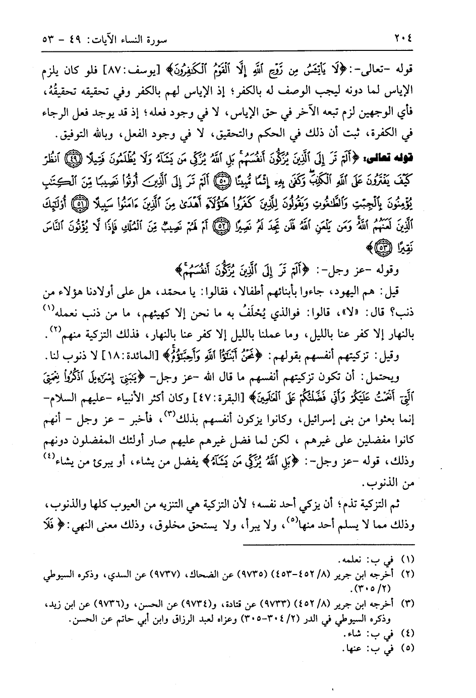 قوله تعالى: (أَلَمْ تَرَ إِلَى الَّذِينَ يُزَكُّونَ أَنْفُسَهُمْ بَلِ اللَّهُ يُزَكِّي مَنْ يَشَاءُ وَلَا يُظْلَمُونَ فَتِيلًا (49) انْظُرْ كَيْفَ يَفْتَرُونَ عَلَى اللَّهِ الْكَذِبَ وَكَفَى بِهِ إِثْمًا مُبِينًا (50) أَلَمْ تَرَ إِلَى الَّذِينَ أُوتُوا نَصِيبًا مِنَ الْكِتَابِ يُؤْمِنُونَ بِالْجِبْتِ وَالطَّاغُوتِ وَيَقُولُونَ لِلَّذِينَ كَفَرُوا هَؤُلَاءِ أَهْدَى مِنَ الَّذِينَ آمَنُوا سَبِيلًا (51) أُولَئِكَ الَّذِينَ لَعَنَهُمُ اللَّهُ وَمَنْ يَلْعَنِ اللَّهُ فَلَنْ تَجِدَ لَهُ نَصِيرًا (52) أَمْ لَهُمْ نَصِيبٌ مِنَ الْمُلْكِ فَإِذًا لَا يُؤْتُونَ النَّاسَ نَقِيرًا (53)