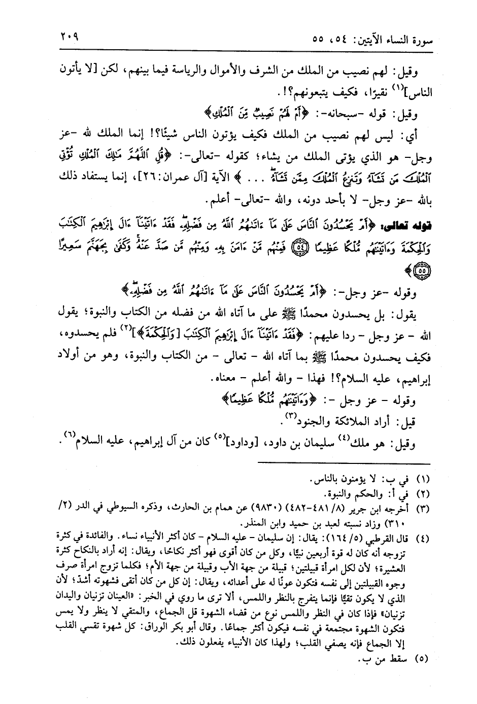 قوله تعالى: (أَمْ يَحْسُدُونَ النَّاسَ عَلَى مَا آتَاهُمُ اللَّهُ مِنْ فَضْلِهِ فَقَدْ آتَيْنَا آلَ إِبْرَاهِيمَ الْكِتَابَ وَالْحِكْمَةَ وَآتَيْنَاهُمْ مُلْكًا عَظِيمًا (54) فَمِنْهُمْ مَنْ آمَنَ بِهِ وَمِنْهُمْ مَنْ صَدَّ عَنْهُ وَكَفَى بِجَهَنَّمَ سَعِيرًا (55)