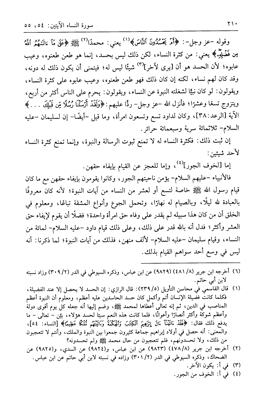 وقوله - عَزَّ وَجَلَّ -: (أَمْ يَحْسُدُونَ النَّاسَ) يعني: محمدًا - صَلَّى اللَّهُ عَلَيهِ وَسَلَّمَ - (عَلَى مَا آتَاهُمُ اللَّهُ مِنْ فَضْلِهِ) يعني: من كثرة النساء، لكن ذلك ليس بحسد، إنما هو طعن طعنوه، وعيب عابوه؛ لأن الحسد هو أن يرى لآخر شيئًا ليس له؛ فيتمنى أن يكون ذلك له دونه، وقد كان لهم نساء، لكنه إن كان ذلك فهو طعن طعنوه، وعيب عابوه على كثرة النساء، ويقولون: لو كان نبيًّا لشغلته النبوة عن النساء، ويقولون: يحرم على الناس أكثر من أربع، ويتزوج تسعًا وعشرًا؛ فأنزل اللَّه - عَزَّ وَجَلَّ - ردَّا عليهم: (وَلَقَدْ أَرْسَلْنَا رُسُلًا مِنْ قَبْلِكَ. . .) وكان لداود تسع وتسعون امرأة، وما قيل -أيضًا- إن لسليمان - عليه السلام - ثلاثمائة سرية وسبعمائة حرائر.