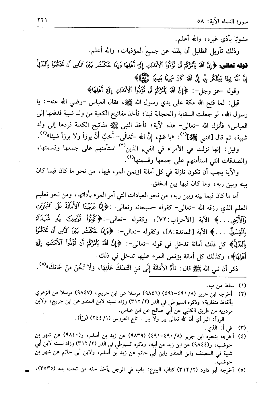 وقوله - عَزَّ وَجَلَّ -: (إِنَّ اللَّهَ يَأْمُرُكُمْ أَنْ تُؤَدُّوا الْأَمَانَاتِ إِلَى أَهْلِهَا)