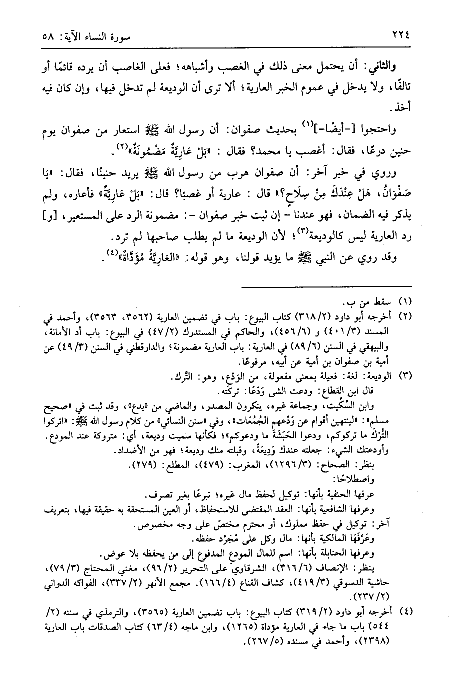 وروي في خبر آخر: أن صفوان هرب من رسول اللَّه - صَلَّى اللَّهُ عَلَيهِ وَسَلَّمَ - يريد حنينًا، فقال: " يَا صَفْوَانُ، هَلْ عِنْدَكَ مِنْ سِلَاح؟ " قال: عارية أو غصبًا؟ قال: " بَلْ عَارِيةٌ " فأعاره، ولم يذكر فيه الضمان، فهو عندنا -إن ثبت خبر صفوان-: مضمونة الرد على المستعير، ورد العارية ليس كالوديعة؛ لأن الوديعة ما لم يطلب صاحبها لم ترد.