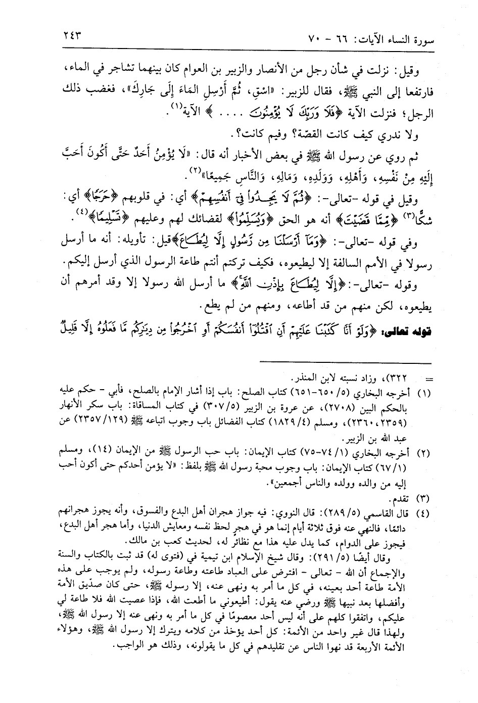 وقيل: نزلت في شأن رجل من الأنصار والزبير بن العوام كان بينهما تشاجر في الماء، فارتفعا إلى النبي - صَلَّى اللَّهُ عَلَيهِ وَسَلَّمَ -، فقال للزبير: " اسْقِ، ثُمَّ أَرْسِلِ المَاءَ إِلَى جَارِكَ "، فغضب ذلك الرجل؛ فنزلت الآية (فَلَا وَرَبِّكَ لَا يُؤْمِنُونَ. . . .) الآية.