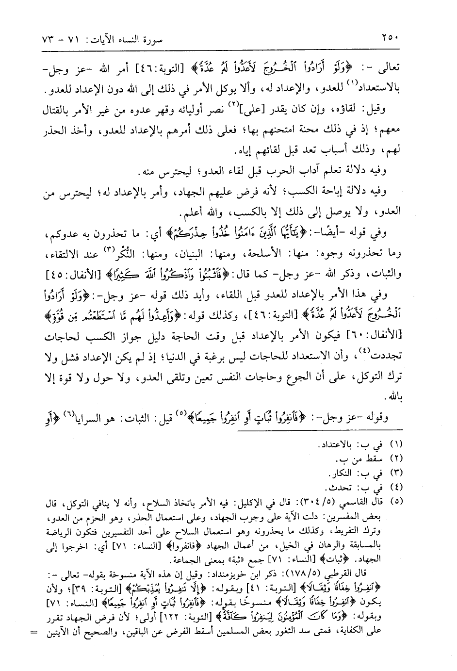 وفي قوله -أيضًا-: (يَا أَيُّهَا الَّذِينَ آمَنُوا خُذُوا حِذْرَكُمْ) أي: ما تحذرون به عدوكم، وما تحذرونه وجوه: منها: الأسلحة، ومنها: البنيان، ومنها: النّكْر عند الالتقاء، والثبات، وذكر اللَّه - عَزَّ وَجَلَّ - كما قال: (فَاثْبُتُوا وَاذْكُرُوا اللَّهَ كَثِيرًا)، وفي هذا الأمر بالإعداد للعدو قبل اللقاء، وأيد ذلك قوله - عَزَّ وَجَلَّ -: (وَلَوْ أَرَادُوا الْخُرُوجَ لَأَعَدُّوا لَهُ عُدَّةً)، وكذلك قوله: (وَأَعِدُّوا لَهُمْ مَا اسْتَطَعْتُمْ مِنْ قُوَّةٍ)، فيكون الأمر بالإعداد قبل وقت الحاجة دليل جواز الكسب لحاجات تجددت، وأن الاستعداد للحاجات ليس برغبة في الدنيا؛ إذ لم يكن الإعداد فشل ولا ترك التوكل، على أن الجوع وحاجات النفس تعين وتلقي العدو، ولا حول ولا قوة إلا باللَّه.