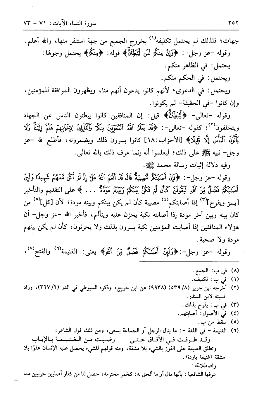 وقوله - عَزَّ وَجَلَّ -: (فَإِنْ أَصَابَتْكُمْ مُصِيبَةٌ قَالَ قَدْ أَنْعَمَ اللَّهُ عَلَيَّ إِذْ لَمْ أَكُنْ مَعَهُمْ شَهِيدًا (72) وَلَئِنْ أَصَابَكُمْ فَضْلٌ مِنَ اللَّهِ لَيَقُولَنَّ كَأَنْ لَمْ تَكُنْ بَيْنَكُمْ وَبَيْنَهُ مَوَدَّةٌ. . .) على التقديم والتأخير يسر ويفرح، إذا أصابتكم مصيبة كأن لم يكن بينكم وبينه مودة؛ لأن كل من كان بينه وبين آخر مودة إذا أصابته نكبة يحزن عليه ويتألم، فأخبر اللَّه - عَزَّ وَجَلَّ - أن هَؤُلَاءِ المنافقين إذا أصابت المؤمنين نكبة يسرون بذلك ولا يحزنون، كأن لم يكن بينهم مودة ولا صحبة.