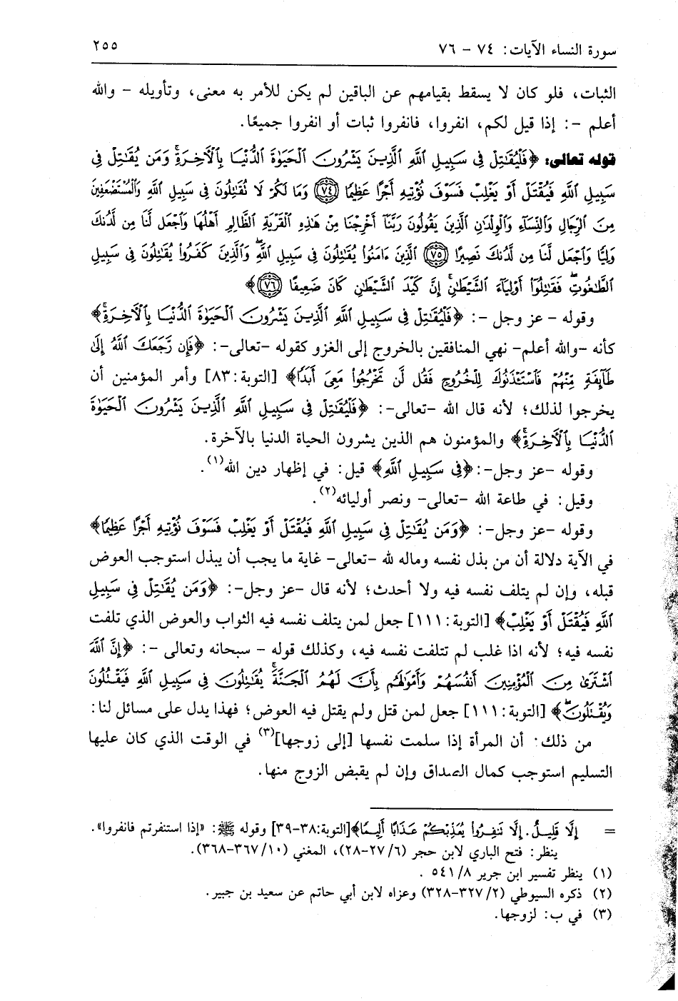 وقوله - عَزَّ وَجَلَّ -: (فَلْيُقَاتِلْ فِي سَبِيلِ اللَّهِ الَّذِينَ يَشْرُونَ الْحَيَاةَ الدُّنْيَا بِالْآخِرَةِ) كأنه - واللَّه أعلم - نهى المنافقين بالخروج إلى الغزو كقوله - تعالى -: (فَإِنْ رَجَعَكَ اللَّهُ إِلَى طَائِفَةٍ مِنْهُمْ فَاسْتَأْذَنُوكَ لِلْخُرُوجِ فَقُلْ لَنْ تَخْرُجُوا مَعِيَ أَبَدًا)، وأمر المؤمنين أن يخرجوا لذلك؛ لأنه قال اللَّه - تعالى -: (فَلْيُقَاتِلْ فِي سَبِيلِ اللَّهِ الَّذِينَ يَشْرُونَ الْحَيَاةَ الدُّنْيَا بِالْآخِرَةِ) والمؤمنون هم الذين يشرون الحياة الدنيا بالآخرة.