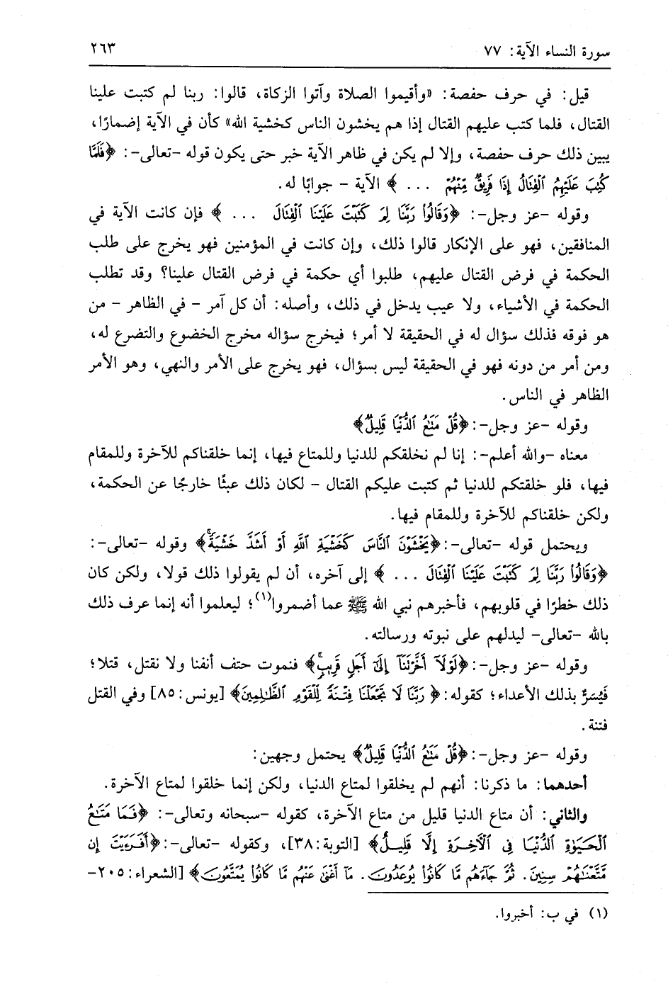 وقوله - عَزَّ وَجَلَّ -: (وَقَالُوا رَبَّنَا لِمَ كَتَبْتَ عَلَيْنَا الْقِتَالَ. . .) فإن كانت الآية في المنافقين، فهو على الإنكار قالوا ذلك، وإن كانت في المؤمنين فهو يخرج على طلب الحكمة في فرض القتال عليهم، طلبوا أي حكمة في فرض القتال علينا؟ وقد تطلب الحكمة في الأشياء، ولا عيب يدخل في ذلك، وأصله: أن كل آمر - في الظاهر - من هو فوقه فذلك سؤال له في الحقيقة لا أمر؛ فيخرج سؤاله مخرج الخضوع والتضرع له، ومن أمر من دونه فهو في الحقيقة ليس بسؤال، فهو يخرج على الأمر والنهي، وهو الأمر الظاهر في الناس.