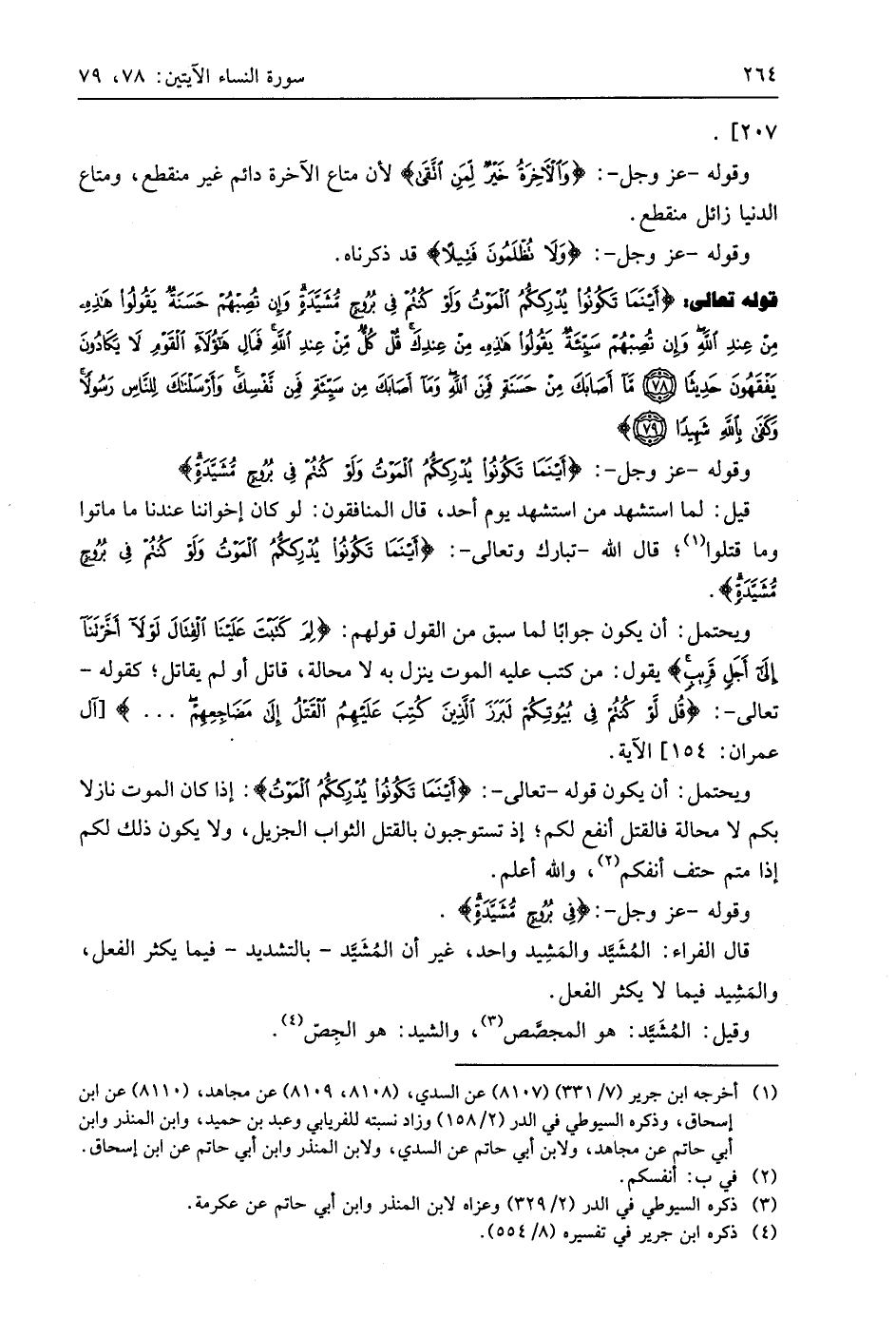 قوله تعالى: (أَيْنَمَا تَكُونُوا يُدْرِكْكُمُ الْمَوْتُ وَلَوْ كُنْتُمْ فِي بُرُوجٍ مُشَيَّدَةٍ وَإِنْ تُصِبْهُمْ حَسَنَةٌ يَقُولُوا هَذِهِ مِنْ عِنْدِ اللَّهِ وَإِنْ تُصِبْهُمْ سَيِّئَةٌ يَقُولُوا هَذِهِ مِنْ عِنْدِكَ قُلْ كُلٌّ مِنْ عِنْدِ اللَّهِ فَمَالِ هَؤُلَاءِ الْقَوْمِ لَا يَكَادُونَ يَفْقَهُونَ حَدِيثًا (78) مَا أَصَابَكَ مِنْ حَسَنَةٍ فَمِنَ اللَّهِ وَمَا أَصَابَكَ مِنْ سَيِّئَةٍ فَمِنْ نَفْسِكَ وَأَرْسَلْنَاكَ لِلنَّاسِ رَسُولًا وَكَفَى بِاللَّهِ شَهِيدًا (79)
