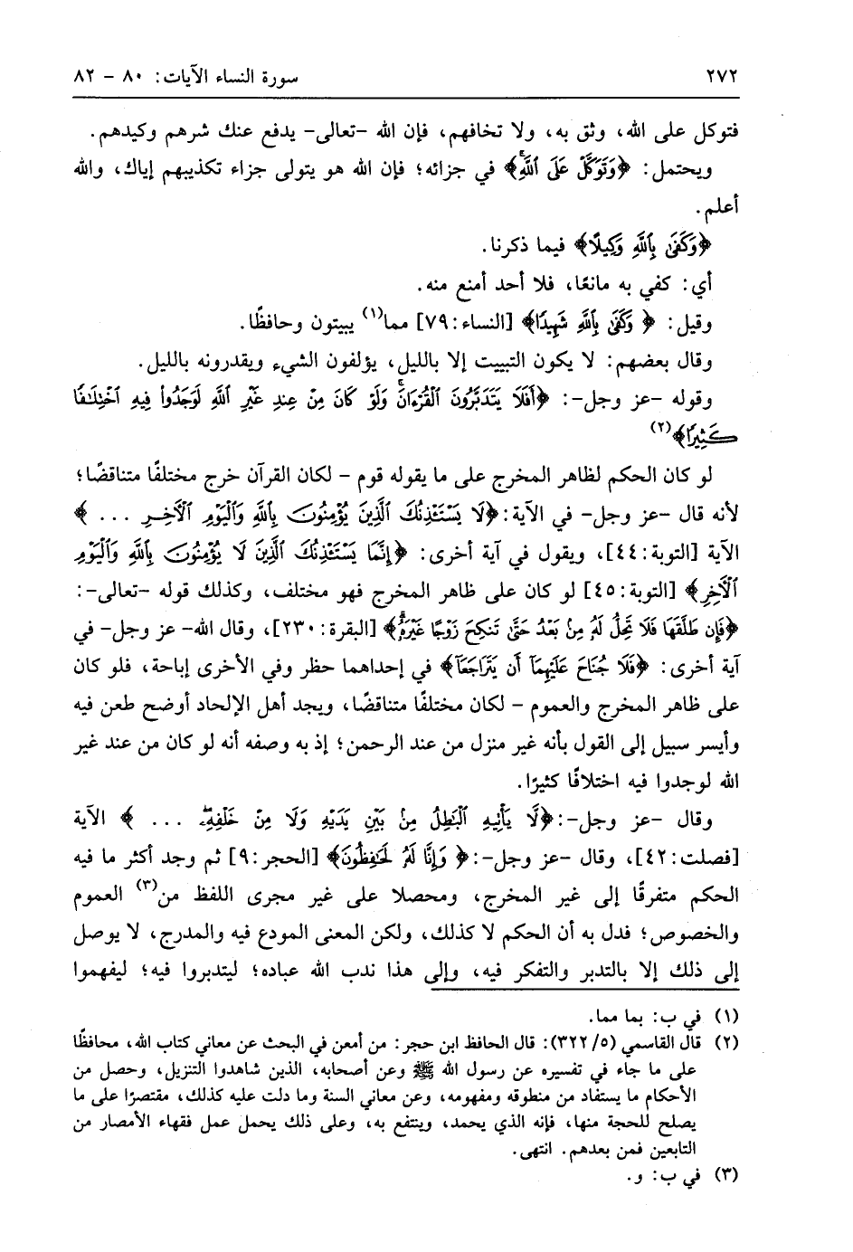 وقال - عَزَّ وَجَلَّ -: (لَا يَأْتِيهِ الْبَاطِلُ مِنْ بَيْنِ يَدَيْهِ وَلَا مِنْ خَلْفِهِ. . .) الآية، وقال - عَزَّ وَجَلَّ -: (وَإِنَّا لَهُ لَحَافِظُونَ)، ثم وجد أكثر ما فيه الحكم متفرقًا إلى غير المخرج، ومحصلا على غير مجرى اللفظ من العموم والخصوص؛ فدل به أن الحكم لا كذلك، ولكن المعنى المودع فيه والمدرج، لا يوصل إلى ذلك إلا بالتدبر والتفكر فيه، وإلى هذا ندب اللَّه عباده؛ ليتدبروا فيه؛ ليفهموا