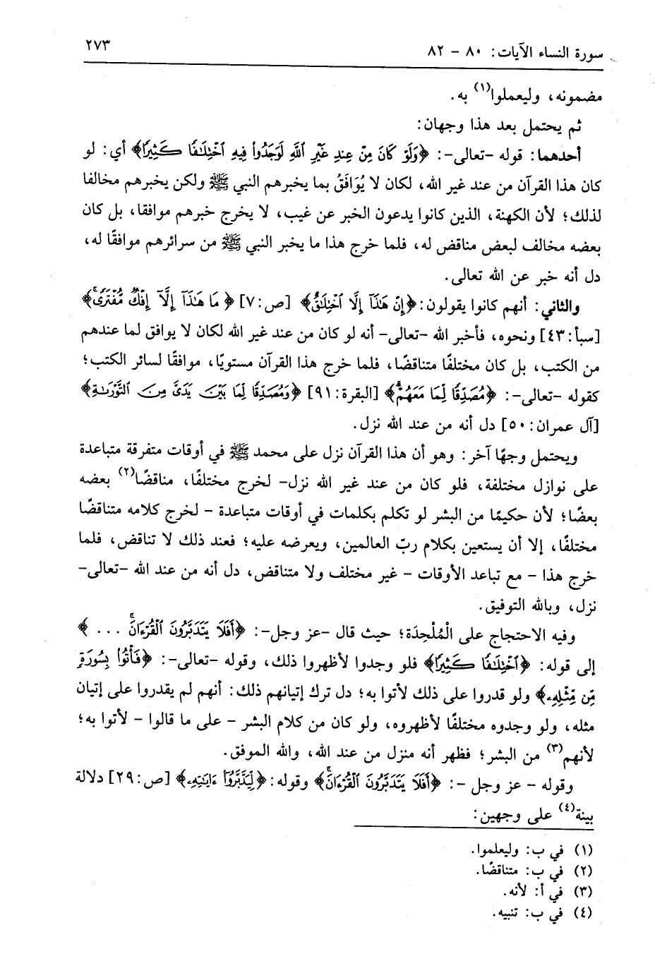 والثاني: أنهم كانوا يقولون: (إِنْ هَذَا إِلَّا اخْتِلَاقٌ)، (مَا هَذَا إِلَّا إِفْكٌ مُفْتَرًى)، ونحوه، فأخبر اللَّه - تعالى - أنه لو كان من عند غير اللَّه لكان لا يوافق لما عندهم من الكتب، بل كان مختلفا متناقضا، فلما خرج هذا القرآن مستويا، موافقًا لسائر الكتب؛ كقوله - تعالى -: (مُصَدِّقًا لِمَا مَعَهُمْ)، (وَمُصَدِّقًا لِمَا بَيْنَ يَدَيَّ مِنَ التَّوْرَاةِ)، دل أنه من عند اللَّه نزل.