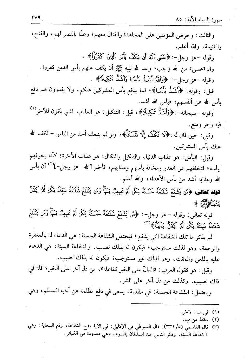 قوله تعالى: (مَنْ يَشْفَعْ شَفَاعَةً حَسَنَةً يَكُنْ لَهُ نَصِيبٌ مِنْهَا وَمَنْ يَشْفَعْ شَفَاعَةً سَيِّئَةً يَكُنْ لَهُ كِفْلٌ مِنْهَا ... (85)