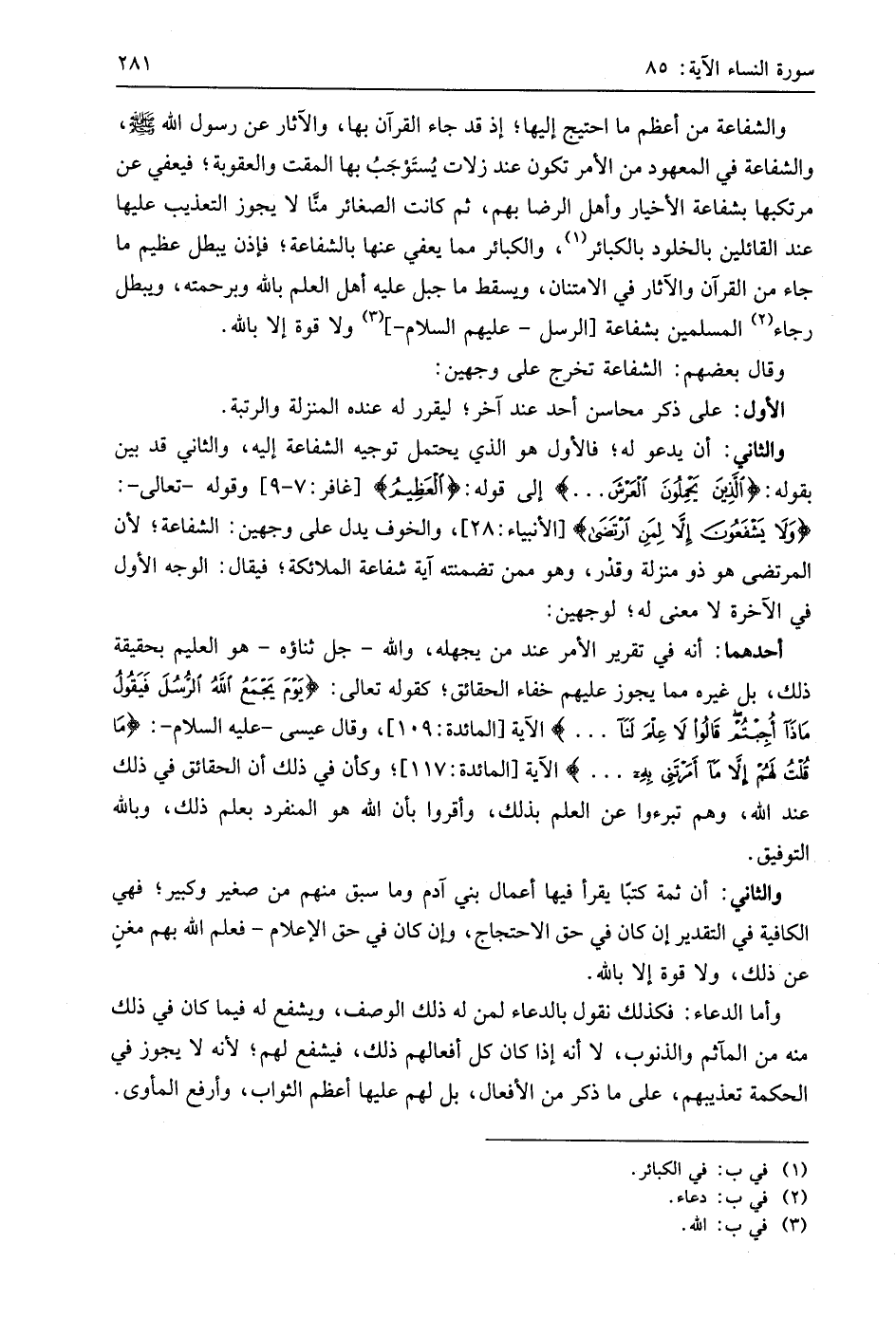 والشفاعة من أعظم ما احتيج إليها؛ إذ قد جاء القرآن بها، والآثار ممن رسول اللَّه - صَلَّى اللَّهُ عَلَيهِ وَسَلَّمَ - والشفاعة في المعهود من الأمر تكون عند زلات يُستَوجَبُ بها المقت والعقوبة؛ فيعفى عن مرتكبها بشفاعة الأخيار وأهل الرضا بهم، ثم كانت الصغائر منا لا يجوز التعذيب عليها عند القائلين بالخلود بالكبائر، والكبائر مما يعفى عنها بالشفاعة؛ فإذن يبطل عظيم ما جاء من القرآن والآثار في الامتنان، ويسقط ما جبل عليه أهل العلم باللَّه وبرحمته، ويبطل رجاء المسلمين بشفاعة الرسل - عليهم السلام - ولا قوة إلا باللَّه.