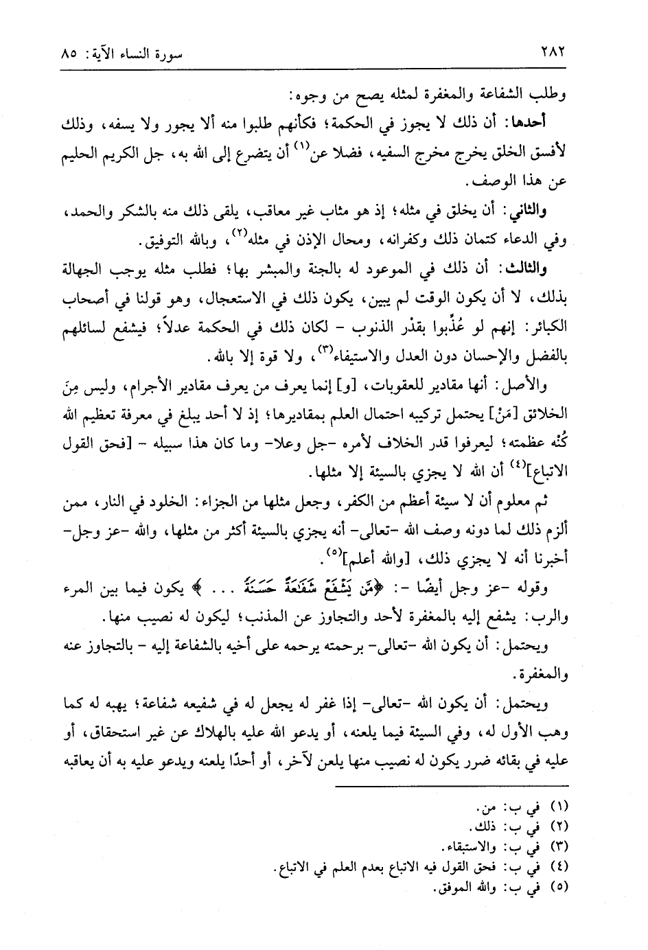 ويحتمل: أن يكون اللَّه - تعالى - إذا غفر له يجعل له في شفيعه شفاعة؛ يهبه له كما وهب الأول له، وفي السيئة فيما يلعنه، أو يدعو اللَّه عليه بالهلاك عن غير استحقاق، أو عليه في بقائه ضرر يكون له نصيب منها يلعن لآخر، أو أحدًا يلعنه ويدعو عليه به أن يعاقبه
