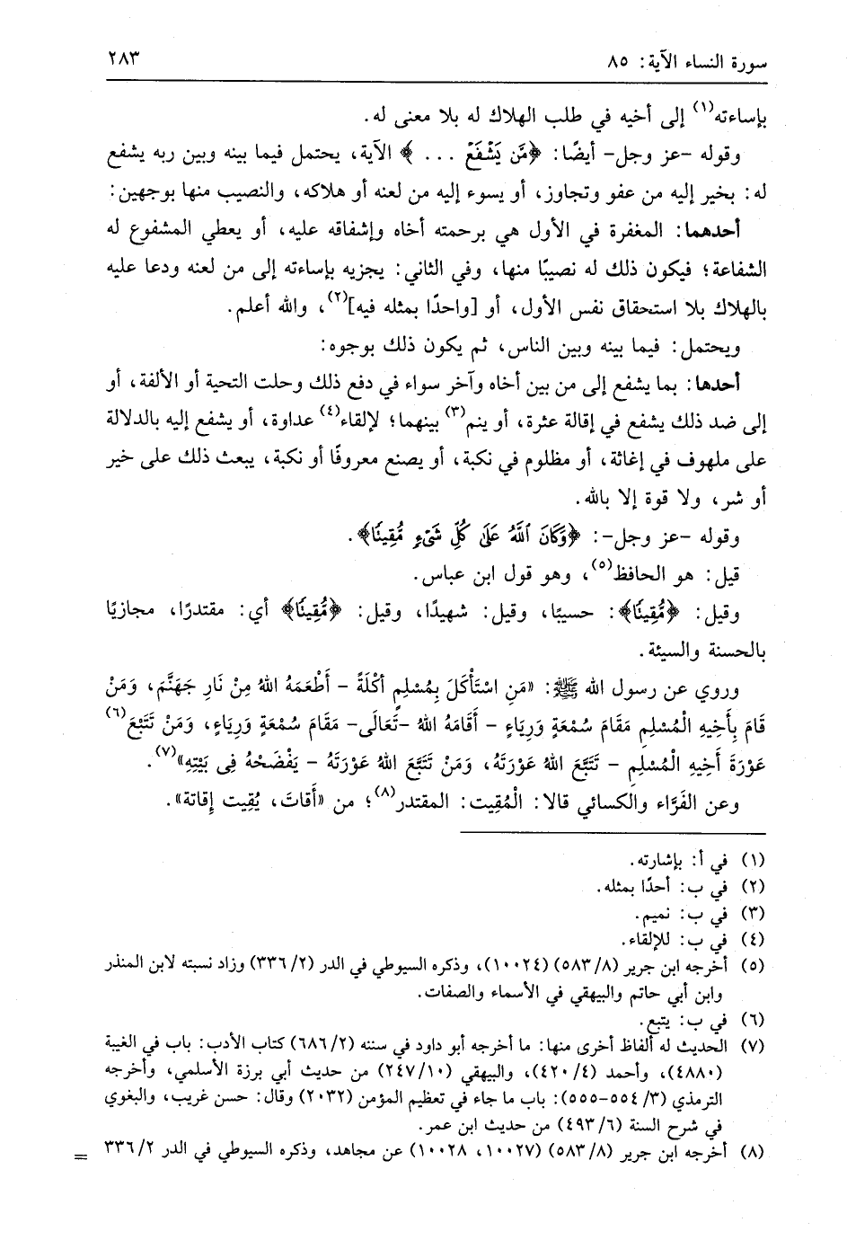 وقوله - عَزَّ وَجَلَّ - أيضًا: (مَنْ يَشْفَعْ. . .) الآية، يحتمل فيما بينه وبين ربه يشفع له: بخير إليه من عفو وتجاوز، أو يسوء إليه من لعنه أو هلاكه، والنصيب منها بوجهين:
