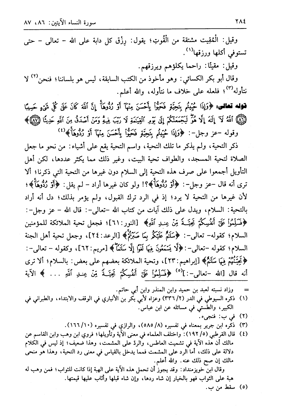 ذكر التحية، ولم يذكر ما تلك التحية، واسم التحية يقع على أشياء: من نحو ما جعل الصلاة لتحية المسجد، والطواف تحية البيت، وغير ذلك مما يكثر عددها، لكن أهل التأويل أجمعوا على صرف هذه التحية إلى السلام دون غيرها من التحية التي ذكرنا؛ ألا ترى أنه قال - عَزَّ وَجَلَّ -: (أَوْ رُدُّوهَا)؟! ولو كان غيرها أراد - لم يقل: (أَوْ رُدُّوهَا)؛ لأن غيرها من التحية لا يرد؛ إذ في الرد ترك القبول، ولم يؤمر بذلك؛ دل أنه أراد بالتحية: السلام، ويدل على ذلك آيات من كتاب اللَّه - تعالى -: قال اللَّه - عَزَّ وَجَلَّ -: (فَسَلِّمُوا عَلَى أَنْفُسِكُمْ تَحِيَّةً مِنْ عِنْدِ اللَّهِ)؛ فجعل تحية الملائكة للمؤمنين السلام؛ كقوله - تعالى -: (سَلَامٌ عَلَيْكُمْ بِمَا صَبَرْتُمْ)، وجعل تحية أهل الجنة السلام؛ كقوله - تعالى -: (لَا يَسْمَعُونَ فِيهَا لَغْوًا إِلَّا سَلَامًا)، وكقوله - تعالى -: (تَحِيَّتُهُمْ فِيهَا سَلَامٌ)، وتحية الملائكة بعضهم على بعض: بالسلام؛ ألا ترى أنه قال اللَّه - تعالى -:، (فَسَلِّمُوا عَلَى أَنْفُسِكُمْ تَحِيَّةً مِنْ عِنْدِ اللَّهِ. . .) الآية