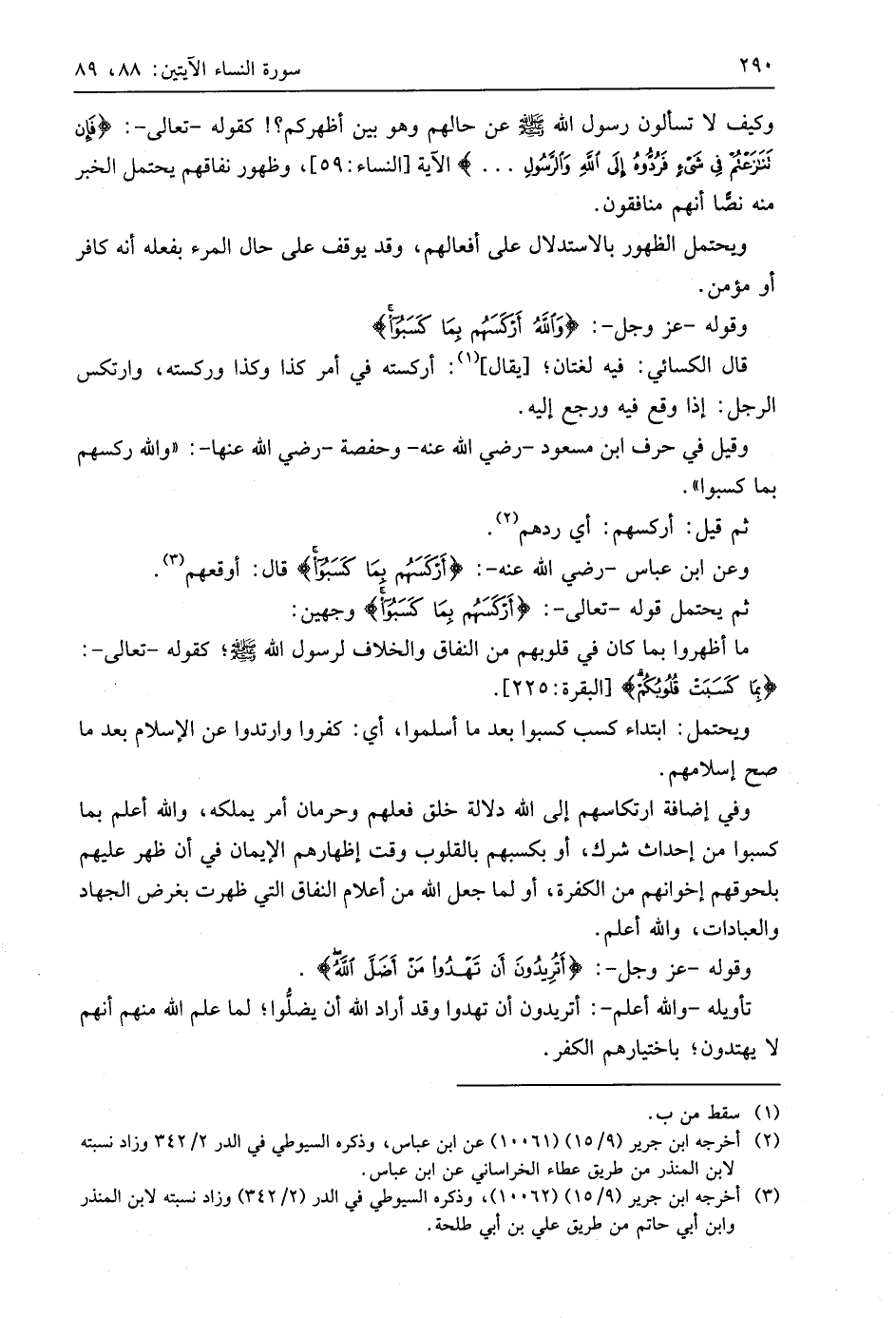 وعن ابن عَبَّاسٍ - رَضِيَ اللَّهُ عَنْهُ -: (أَرْكَسَهُمْ بِمَا كَسَبُوا) قال: أوقعهم.