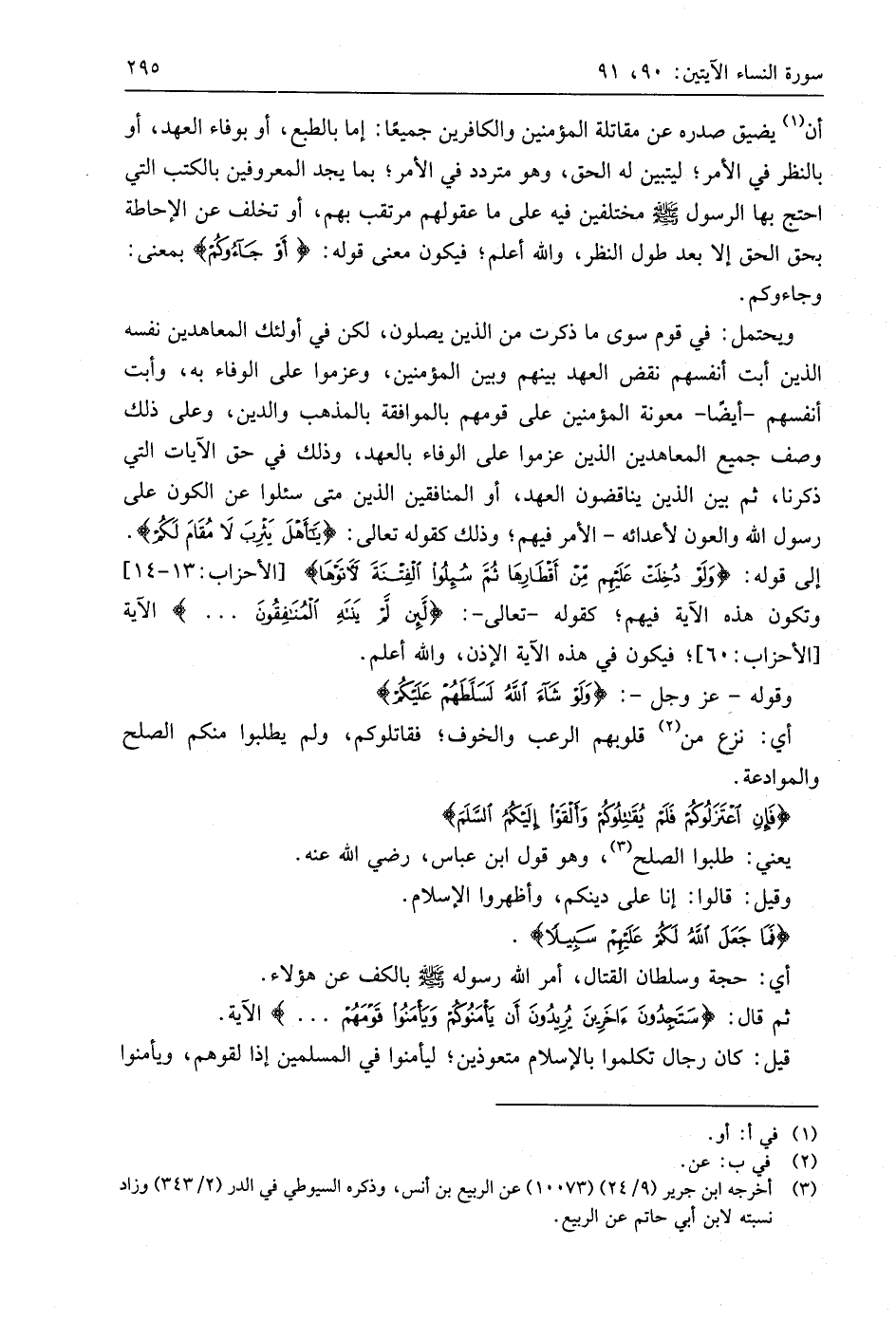 أن يضيق صدره عن مقاتلة المؤمنين والكافرين جميعًا: إما بالطبع، أو بوفاء العهد، أو بالنظر في الأمر؛ ليتبين له الحق، وهو متردد في الأمر؛ بما يجد المعروفين بالكتب التي احتج بها الرسول - صَلَّى اللَّهُ عَلَيهِ وَسَلَّمَ - مختلفين فيه على ما عقولهم مرتقب بهم، أو تخلف عن الإحاطة بحق الحق إلا بعد طول النظر، واللَّه أعلم؛ فيكون معنى قوله: (أَوْ جَاءُوكُمْ) بمعنى: وجاءوكم.