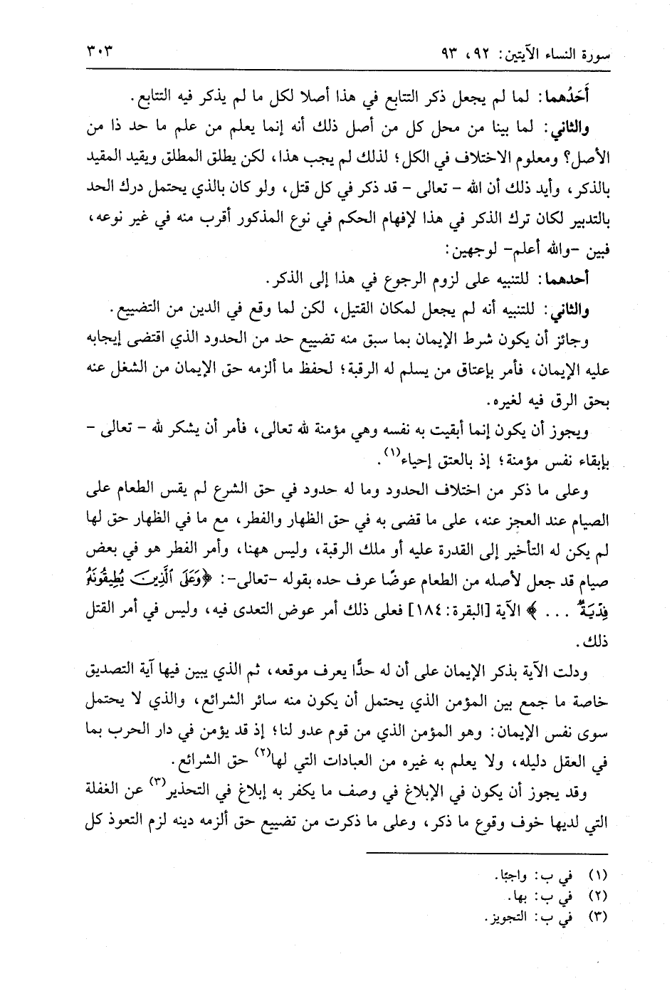 ودلت الآية بذكر الإيمان على أن له حدا يعرف موقعه، ثم الذي يبين فيها آية التصديق خاصة ما جمع بين المؤمن الذي يحتمل أن يكون منه سائر الشرائع، والذي لا يحتمل سوى نفس الإيمان: وهو المؤمن الذي من قوم عدو لنا؛ إذ قد يؤمن في دار الحرب بما في العقل دليله، ولا يعلم به غيره من العبادات التي لها حق الشرائع.