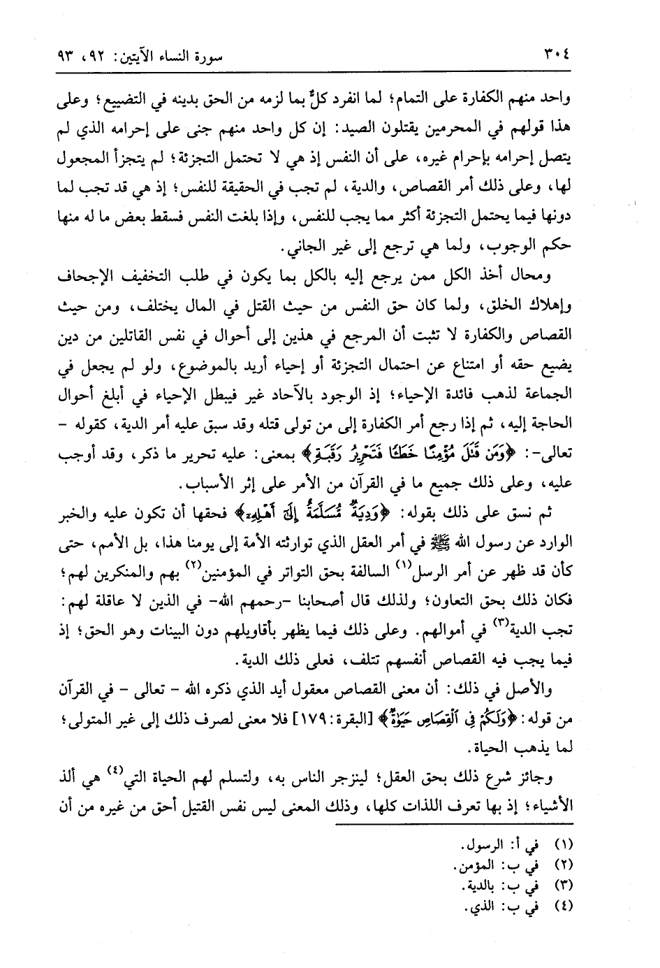 ومحال أخذ الكل ممن يرجع إليه بالكل بما يكون في طلب التخفيف الإجحاف وإهلاك الخلق، ولما كان حق النفس من حيث القتل في المال يختلف، ومن حيث القصاص والكفارة لا تثبت أن المرجع في هذين إلى أحوال في نفس القاتلين من دين يضيع حقه أو امتناع عن احتمال التجزئة أو إحياء أريد بالموضوع، ولو لم يجعل في الجماعة لذهب فائدة الإحياء؛ إذ الوجود بالآحاد غير فيبطل الإحياء في أبلغ أحوال الحاجة إليه، ثم إذا رجع أمر الكفارة إلى من تولى قتله وقد سبق عليه أمر الدية، كقوله - تعالى -: (وَمَنْ قَتَلَ مُؤْمِنًا خَطَأً فَتَحْرِيرُ رَقَبَةٍ) بمعنى: عليه تحرير ما ذكر، وقد أوجب عليه، وعلى ذلك جميع ما في القرآن من الأمر على إثر الأسباب.