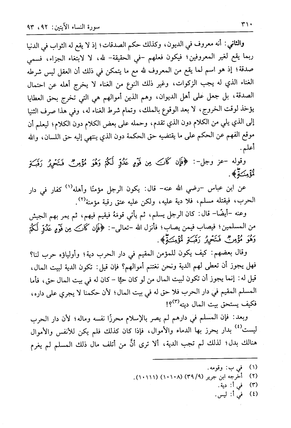 وعنه -أيضًا- قال: كان الرجل يسلم، ثم يأتي قومَهُ فيقيم فيهم، ثم يمر بهم الجيش من المسلمين؛ فيصاب فيمن يصاب؛ فأنزل اللَّه - تعالى -: (فَإِنْ كَانَ مِنْ قَوْمٍ عَدُوٍّ لَكُمْ وَهُوَ مُؤْمِنٌ فَتَحْرِيرُ رَقَبَةٍ مُؤْمِنَةٍ).