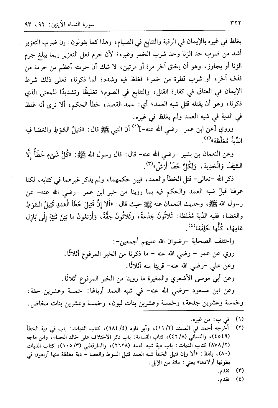 ذكر اللَّه - تعالى - قتل الخطأ والعمد، فبين حكمهما، ولم يذكر غيرهما في كتابه، لكنا عرفنا قبلُ شبه العمد والحكم فيه بما روينا من خبر ابن عمر - رَضِيَ اللَّهُ عَنْهُ - عن رسول اللَّه - صَلَّى اللَّهُ عَلَيهِ وَسَلَّمَ -، وحديث النعمان عنه - صَلَّى اللَّهُ عَلَيهِ وَسَلَّمَ - حيث قال: " أَلَا إِنَّ قَتيلَ خَطَإ الْعَمدِ قَتِيلُ السوْطِ والعَصَا، ففيه الدية مُغَلَّظة: ثَلاثُونَ جَذَعةً، وثَلاثُونَ حِقَّةً، وَأَرْبَعُونَ ما بَينَ ثَنيَّةٍ إِلَىْ بَازِل عَامِهَا، كلُّها خَلِفَة ".