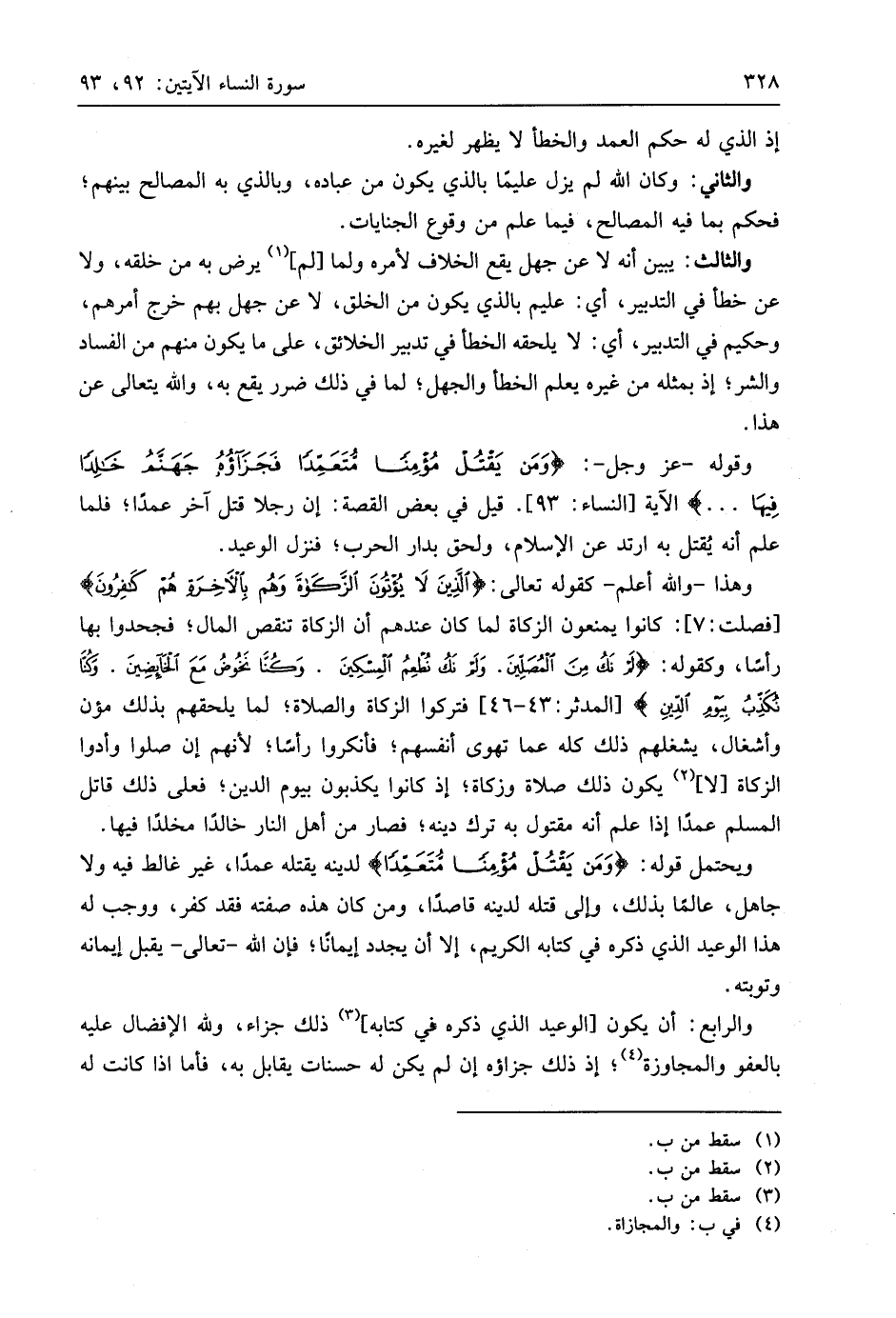 ويحتمل قوله: (وَمَنْ يَقْتُلْ مُؤْمِنًا مُتَعَمِّدًا) لدينه يقتله عمدا، غير غالط فيه ولا جاهل، عالما بذلك، وإلى قتله لدينه قاصدًا، ومن كان هذه صفته فقد كفر، ووجب له هذا الوعيد الذي ذكره في كتابه الكريم، إلا أن يجدد إيمانا؛ فإن اللَّه - تعالى - يقبل إيمانه وتوبته.