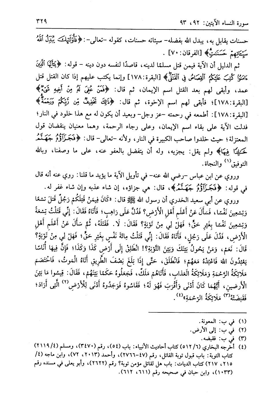 ثم الدليل أن الآية فيمن قتل مسلمًا لدينه، قاصدا لنفسه دون دينه - قوله: (يَا أَيُّهَا الَّذِينَ آمَنُوا كُتِبَ عَلَيْكُمُ الْقِصَاصُ فِي الْقَتْلَى)، وإنما يكتب عليهم إذا كان القتل قتل عمد، وأبقى لهم بعد القتل اسم الإيمان، ثم قال: (فَمَنْ عُفِيَ لَهُ مِنْ أَخِيهِ شَيْءٌ)؛ فأبقى لهم اسم الإخوة، ثم قال: (ذَلِكَ تَخْفِيفٌ مِنْ رَبِّكُمْ وَرَحْمَةٌ) أطمعه في رحمته - عَزَّ وَجَلَّ - وبعيد أن يكون له مع هذا خلود في النار؛ فدلت الآية على بقاء اسم الإيمان، وعلى رجاء الرحمة، وهما معنيان ينقضان قول المعتزلة؛ حيث خلدوا صاحب الكبيرة في النار، ولأنه - تعالى - قال: (فَجَزَاؤُهُ جَهَنَّمُ خَالِدًا فِيهَا) ولم يقل: يجزيه، وله أن يتفضل بالعفو عنه، على ما وصفنا، وبالله التوفيق والنجاة.