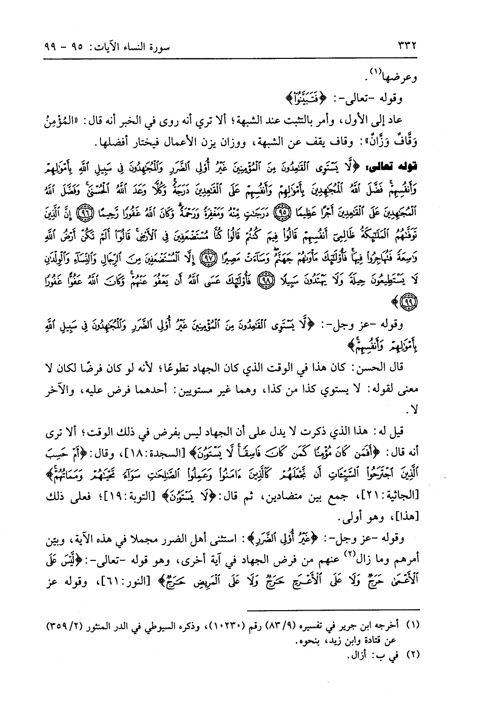 قوله تعالى: (لَا يَسْتَوِي الْقَاعِدُونَ مِنَ الْمُؤْمِنِينَ غَيْرُ أُولِي الضَّرَرِ وَالْمُجَاهِدُونَ فِي سَبِيلِ اللَّهِ بِأَمْوَالِهِمْ وَأَنْفُسِهِمْ فَضَّلَ اللَّهُ الْمُجَاهِدِينَ بِأَمْوَالِهِمْ وَأَنْفُسِهِمْ عَلَى الْقَاعِدِينَ دَرَجَةً وَكُلًّا وَعَدَ اللَّهُ الْحُسْنَى وَفَضَّلَ اللَّهُ الْمُجَاهِدِينَ عَلَى الْقَاعِدِينَ أَجْرًا عَظِيمًا (95) دَرَجَاتٍ مِنْهُ وَمَغْفِرَةً وَرَحْمَةً وَكَانَ اللَّهُ غَفُورًا رَحِيمًا (96) إِنَّ الَّذِينَ تَوَفَّاهُمُ الْمَلَائِكَةُ ظَالِمِي أَنْفُسِهِمْ قَالُوا فِيمَ كُنْتُمْ قَالُوا كُنَّا مُسْتَضْعَفِينَ فِي الْأَرْضِ قَالُوا أَلَمْ تَكُنْ أَرْضُ اللَّهِ وَاسِعَةً فَتُهَاجِرُوا فِيهَا فَأُولَئِكَ مَأْوَاهُمْ جَهَنَّمُ وَسَاءَتْ مَصِيرًا (97) إِلَّا الْمُسْتَضْعَفِينَ مِنَ الرِّجَالِ وَالنِّسَاءِ وَالْوِلْدَانِ لَا يَسْتَطِيعُونَ حِيلَةً وَلَا يَهْتَدُونَ سَبِيلًا (98) فَأُولَئِكَ عَسَى اللَّهُ أَنْ يَعْفُوَ عَنْهُمْ وَكَانَ اللَّهُ عَفُوًّا غَفُورًا (99)